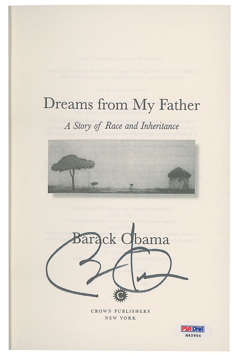 Signed book: Dreams from My Father. First edition, later printing. NY: Crown Publishers, 2004. Hardcover with dust jacket, 6.5 x 9.5, 442 pages. Signed on the title page in black felt tip. Autographic condition: fine, with a PSA/DNA authentication label affixed to bottom of signed page. Book condition: VG+/VG+. Brown and yellow paper-covered boards; minimal wear to edges and previous owner’s name in ink to ffep, otherwise NF condition. Dust jacket has some slight creasing to corners and spine ends and light soiling. Accompanied by a full letter of authenticity from PSA/DNA.