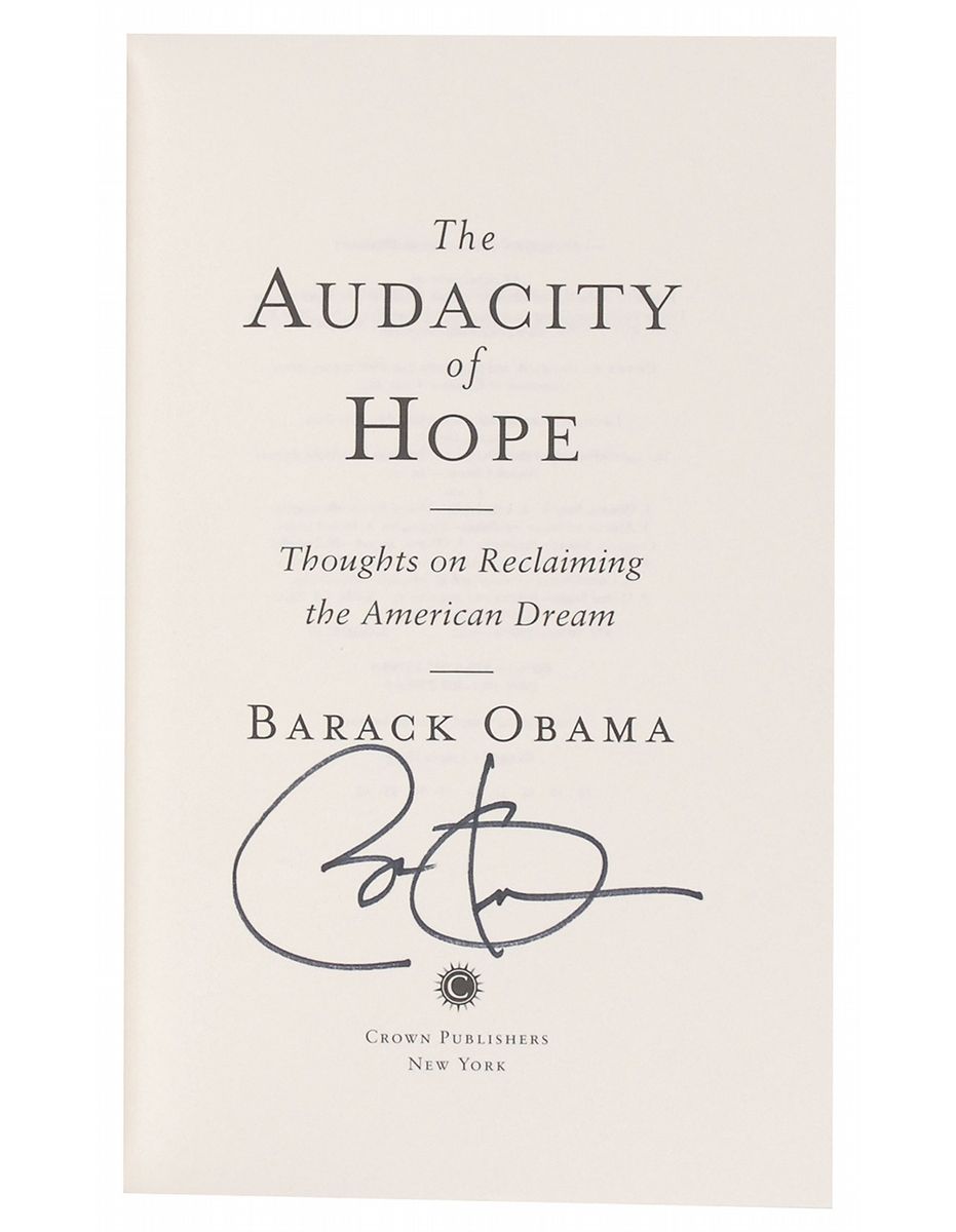 Signed book: The Audacity of Hope. Later printing. NY: Crown Publishers, 2006. Hardcover with dust jacket, 6.5 x 9.5, 375 pages. Signed on the title page in black felt tip. Autographic condition: very fine. Book condition: VG+/VG+. Black paper-covered boards with gilt title to spine; minor rubbing to edges; minimal soiling to textblock edges; previous owner’s inscriptions to rfep and rear pastedown. Dust jacket has minor creasing to edges (mostly at corners and spine-ends); and slight soiling to rear.