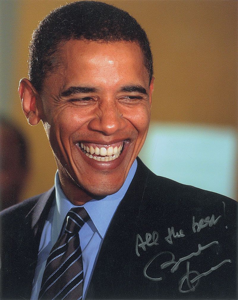 Uncommon color satin-finish 8 x 10 photo of Obama broadly smiling, nicely signed against his dark jacket in silver ink, “All the best! Barack Obama.” In fine condition.