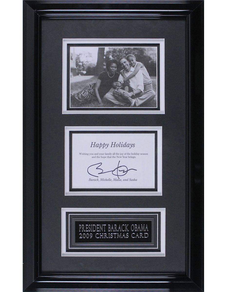 White House Christmas card from 2009, 6 x 4.25, with a pre-printed holiday sentiment in the center, signed in black felt tip by Obama. Triple-matted and framed with a family portrait and an engraved plaque to an overall size of 13.25 x 21.75. In very fine condition.