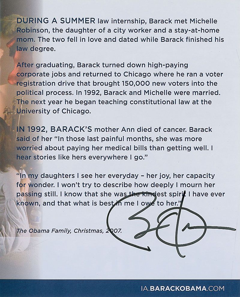 Program from Obama’s 2008 presidential campaign, 22 pages, 7 x 8.5, signed inside in black felt tip. In fine condition. Consignor notes that this autograph was obtained on August 25, 2008, at a town hall meeting at the Mississippi Valley Fairgrounds in Davenport, Iowa. Three days later, Obama officially accepted the Democratic nomination for President at the National Convention in Denver.