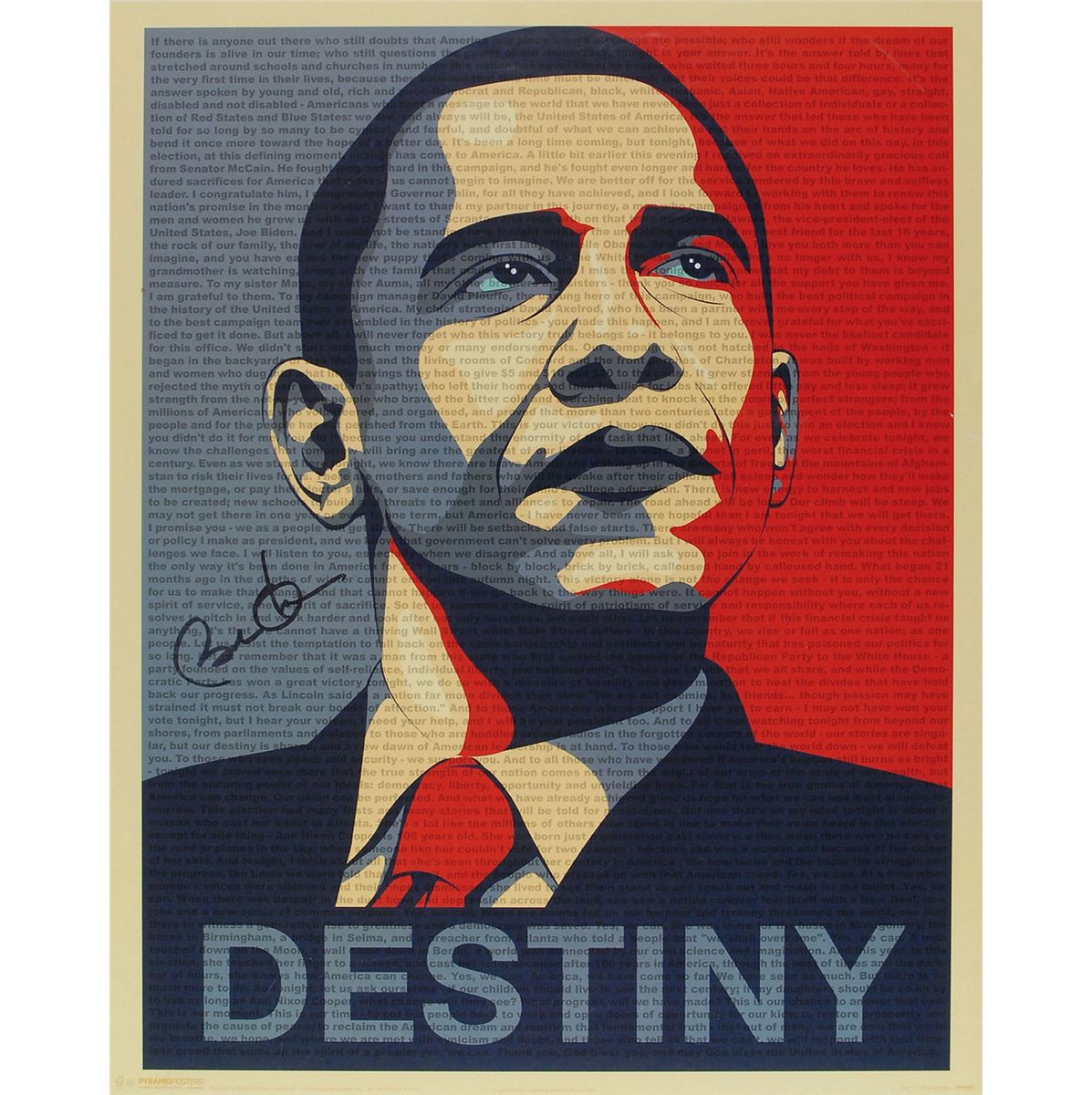 Color 16 x 20 poster entitled ‘Destiny,’ based on the iconic Shepard Fairey ‘Hope’ design, featuring a portrait of Obama imposed over the text of his 2008 victory speech given at Grant Park in Chicago, signed in black felt tip. In fine condition.