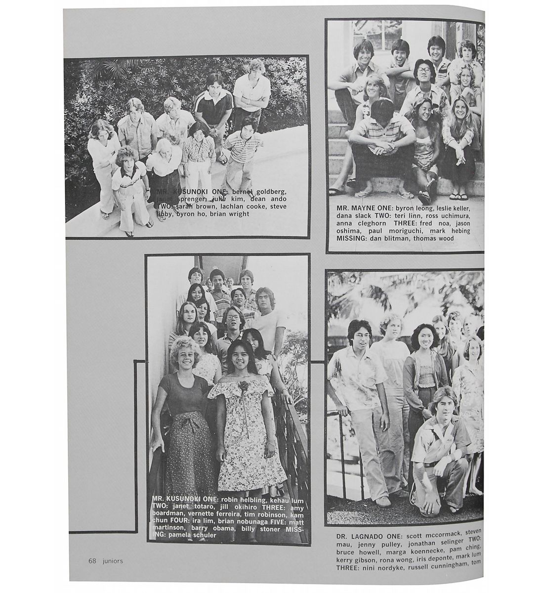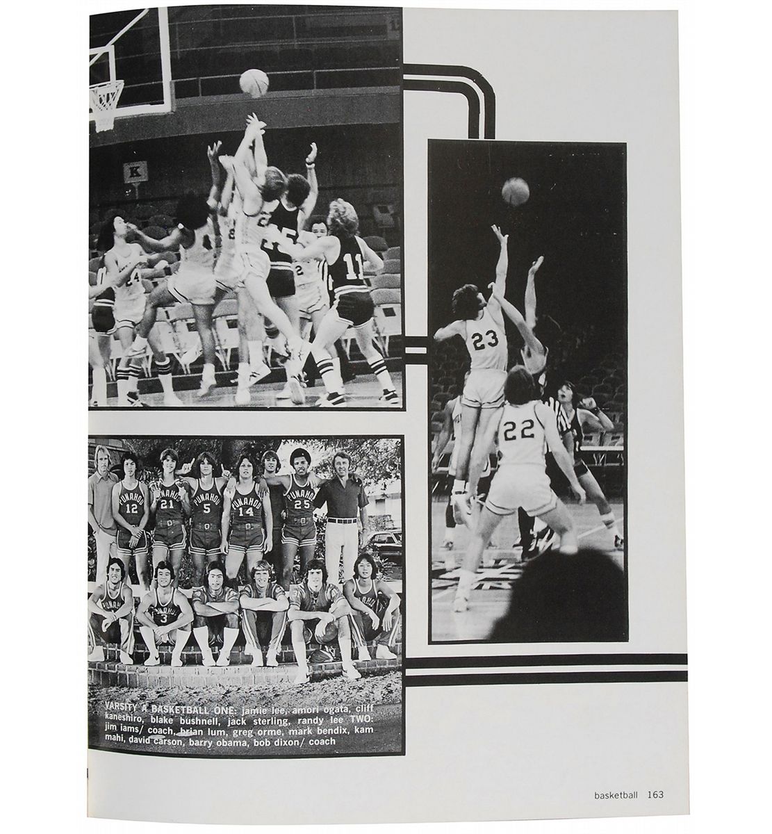 Official 1978 Oahuan yearbook from Punahou School in Honolulu, Hawaii, 9 x 12.25, 328 pages, featuring images of Obama during his junior year with his homeroom class and as a member of the varsity basketball team, identified in both images as “Barry Obama.” In fine condition, with a loose front hinge and other students’ signatures throughout. Obama attended Punahou School with the aid of a scholarship from fifth grade in 1971 through his graduation from high school in 1979, a year in which he also won the state championship as a member of the basketball team. A great item from the future-president’s formative years.