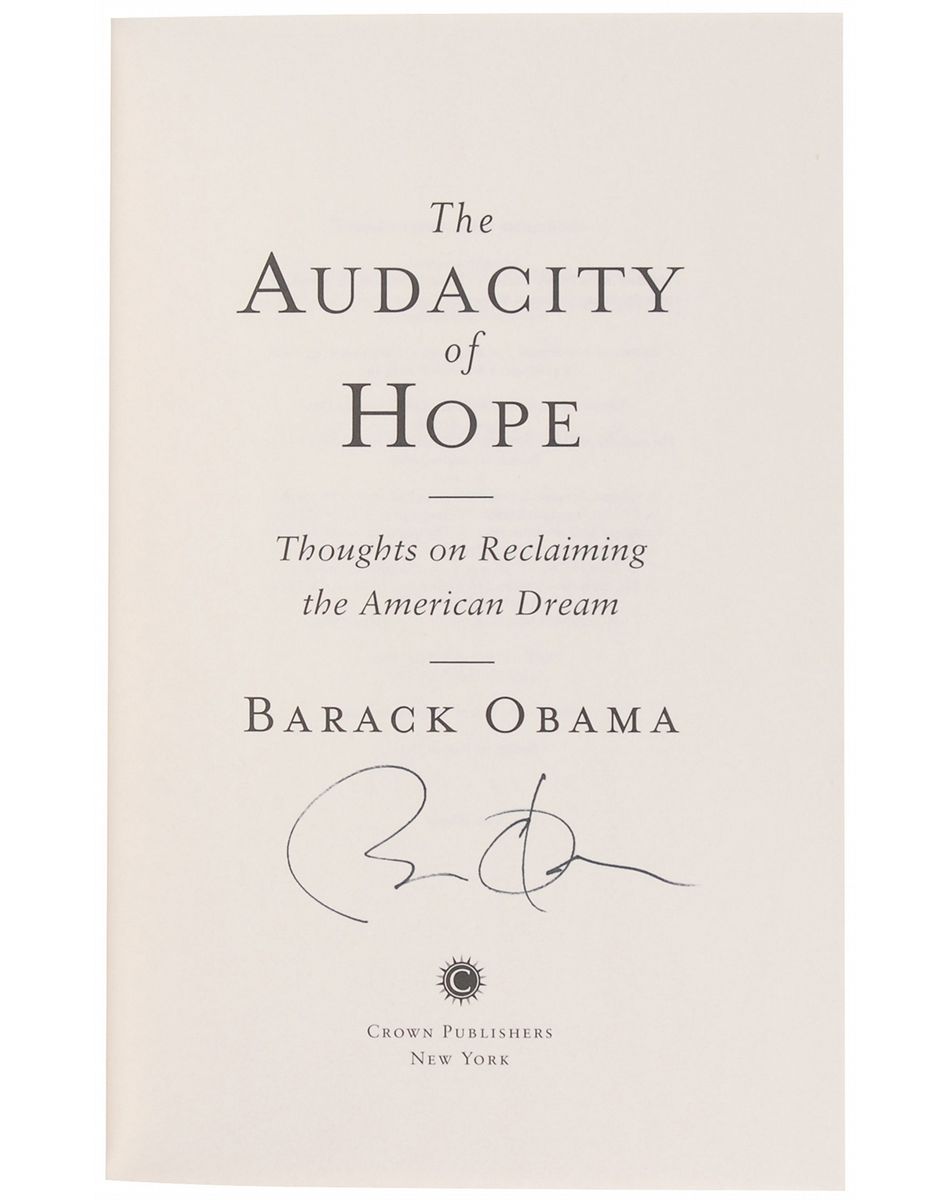 Signed book: The Audacity of Hope. First edition, first printing. NY: Crown Publishers, 2006. Hardcover with dust jacket, 6.5 x 9.5, 375 pages. Signed on the title page in black ink by Obama. In very fine condition. Accompanied by a flier from the Philadelphia signing.