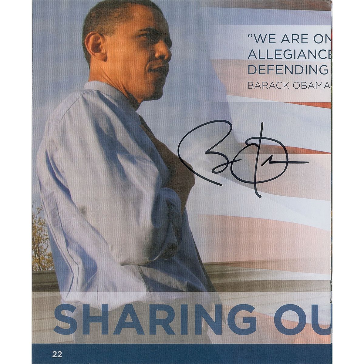 Presidential campaign booklet, 7 x 8.5, 22 pages, signed in black felt tip on the last page next to his image. In fine condition. Consignor notes that this autograph was obtained on August 25, 2008, at a town hall meeting at the Mississippi Valley Fairgrounds in Davenport, Iowa. Three days later, Obama officially accepted the Democratic nomination for President at the National Convention in Denver.