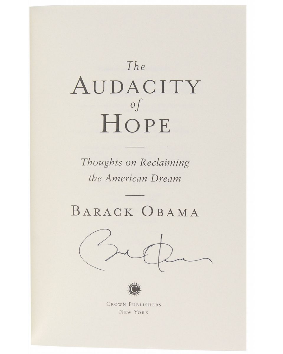 Signed book: The Audacity of Hope. First edition, first printing. NY: Crown Publishers, 2006. Hardcover with dust jacket, 6.5 x 9.5, 375 pages. Nicely signed on the title page in black felt tip. In very fine condition. Accompanied by an advertisement for an Obama lecture and book signing held in Philadelphia on October 21, 2006, following the book’s release, and a sales receipt for the purchase of signed books from the event dated one week later. A fine example signed earlier than typically seen.