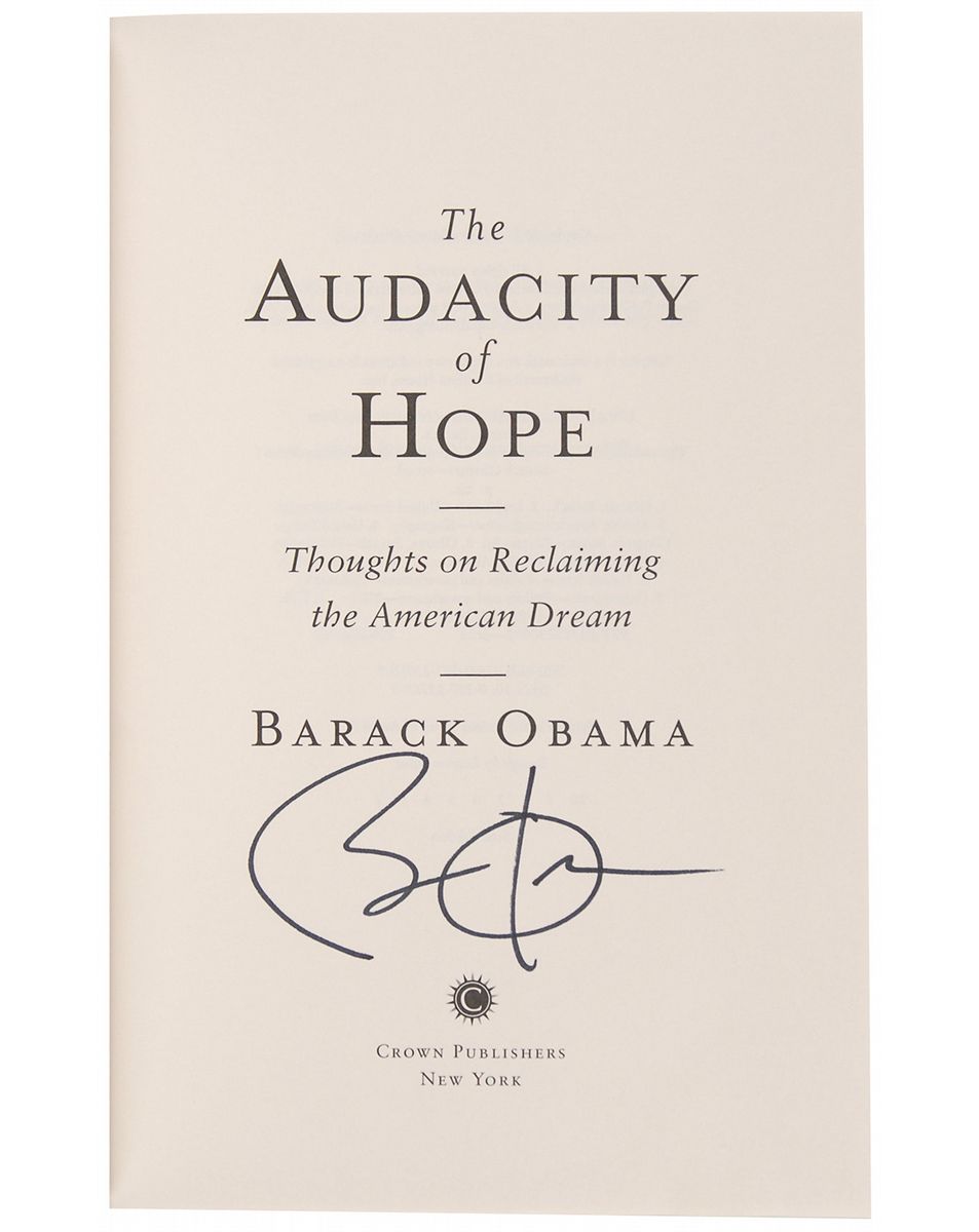 Signed book: The Audacity of Hope. First edition. NY: Crown Publishers, 2006. Hardcover with dust jacket, 6.5 x 9.5, 375 pages. Attractively signed on the title page in black felt tip. In fine condition, with a small stain to the bottom edge of the dust jacket.