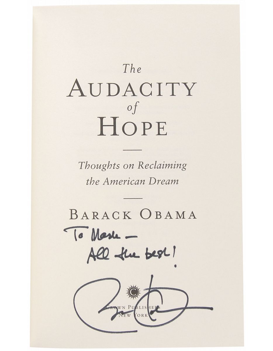 Signed book: The Audacity of Hope. First edition, later printing. NY: Crown Publishers, 2006. Hardcover with dust jacket, 6.5 x 9.5, 375 pages. Signed and inscribed on the title page in black felt tip, “To Merle—All the best! Barack Obama.” In fine condition, with light edge wear and soiling to the dust jacket. Accompanied by a ticket from the October 2014 event at which this book was presumably signed.