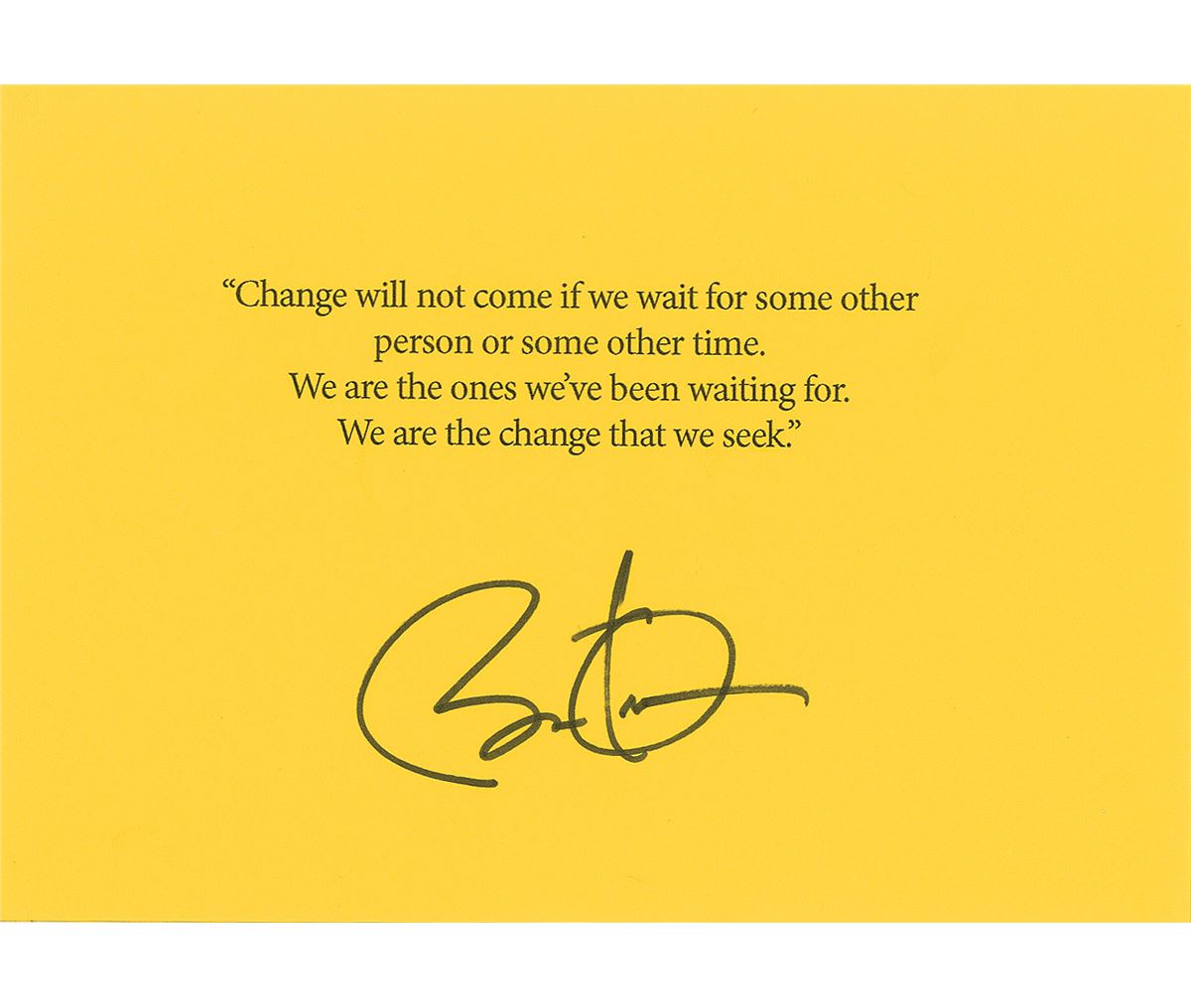 Desirable felt tip signature, “Barack Obama,” on a yellow 7.75 x 5.5 sheet, to which was later added a typed quote from his 2008 presidential campaign, in full: “Change will not come if we wait for some other person or some other time. We are the ones we’ve been waiting for. We are the change that we seek.” In fine condition.