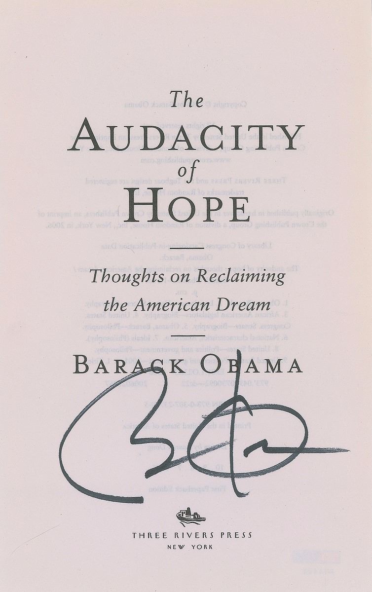 Title page removed from a first paperback edition of The Audacity of Hope, 5 x 7.75, signed in black felt tip. In fine condition, with trivial show-through from a PSA/DNA label affixed to the reverse.