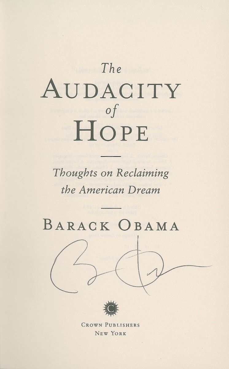 Signed book: The Audacity of Hope. First edition. NY: Crown Publishers, 2006. Hardcover with dust jacket, 6.5 x 9.5, 375 pages. Signed on the title page in black ballpoint. In fine condition.
