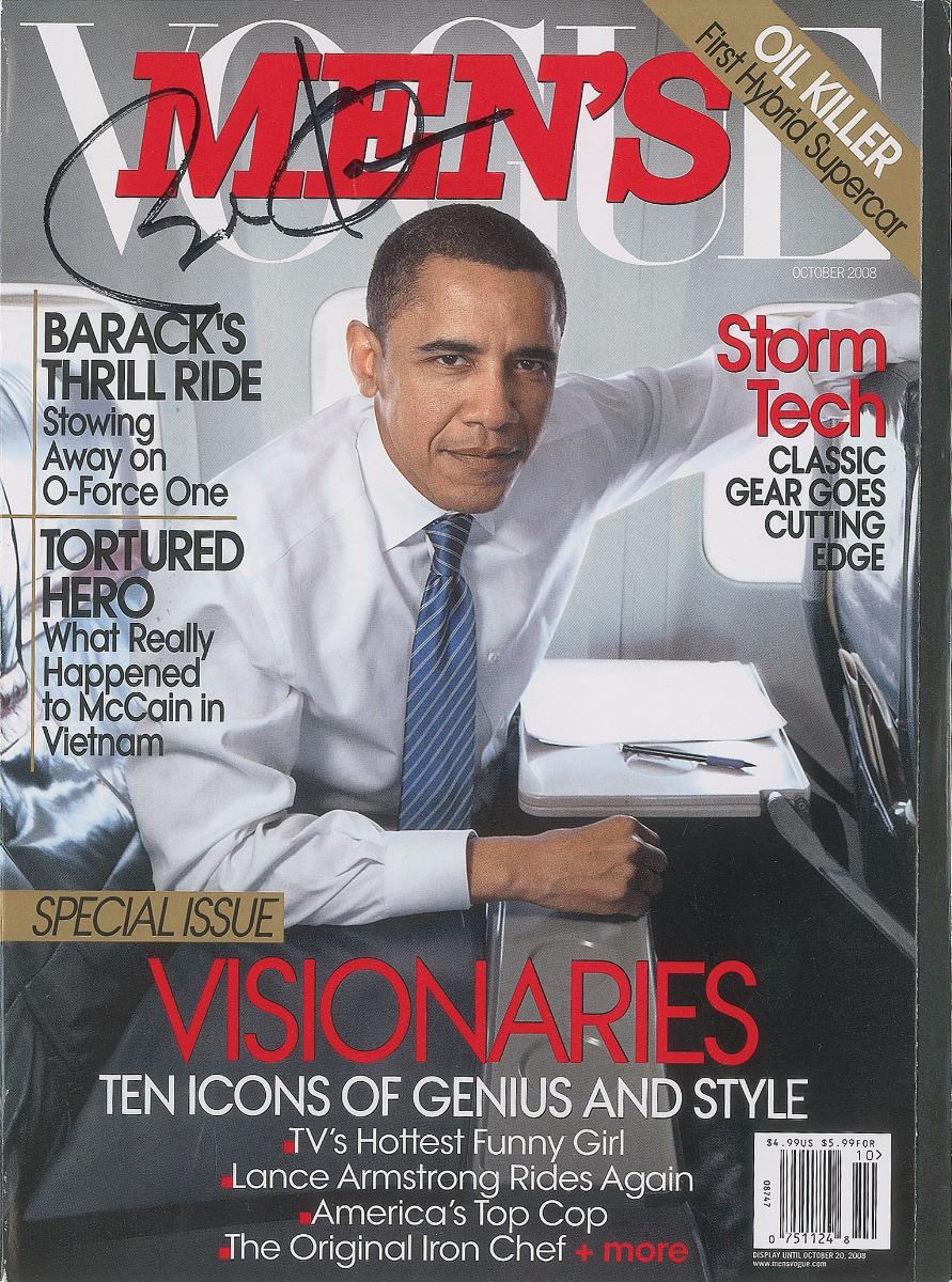 Men’s Vogue magazine from October 2008, 148 pages, 8 x 10.75, signed on the front cover in black felt tip. In fine condition, with trivial edgewear and slight irregular ink adhesion to the signature. Consignor notes that the signature was obtained at a rally at the University of Missouri on October 30, 2008.
