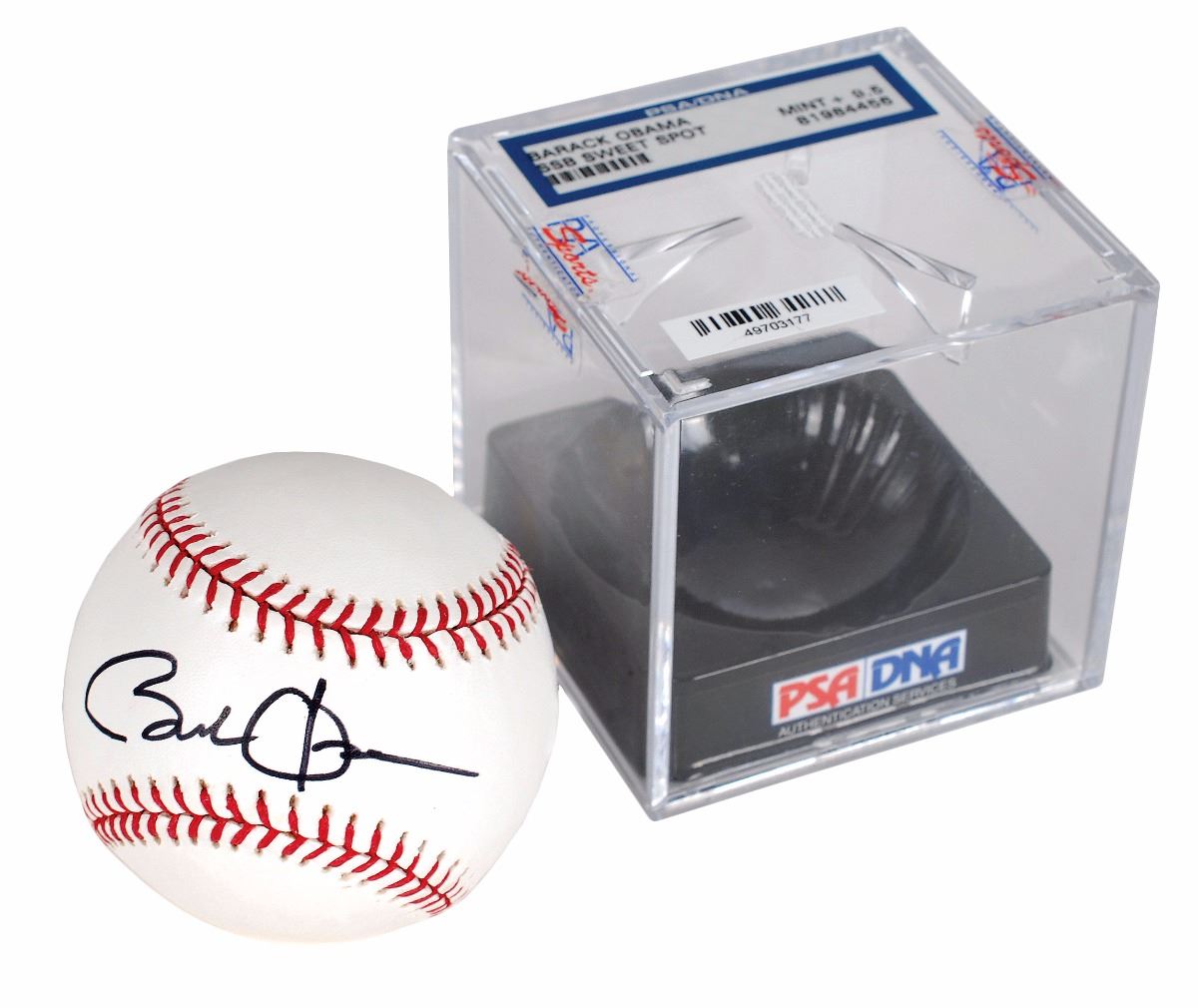 Choice official Rawlings Major League (Selig) baseball signed in black felt tip on the sweet spot by Obama. Accompanied by its plastic PSA/DNA authentication cube,grading the ball “Mint+ 9.5” (autograph grade 10, and ball grade 9.5). [Note: the PSA sealing tape is present but has been slit so the ball can easily be removed if desired]. In very fine condition. A pristine signed baseball from the world’s most influential Chicago White Sox fan.