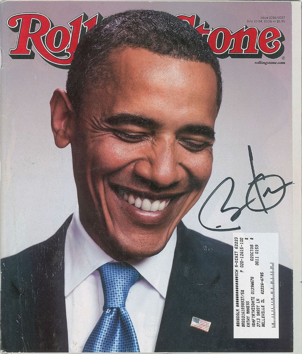 Issue of Rolling Stone from July 2008 featuring a famous image of President Obama on the front cover, 10 x 11.75, 120 pages, signed in black felt tip as president. In fine condition, with general light handling wear.