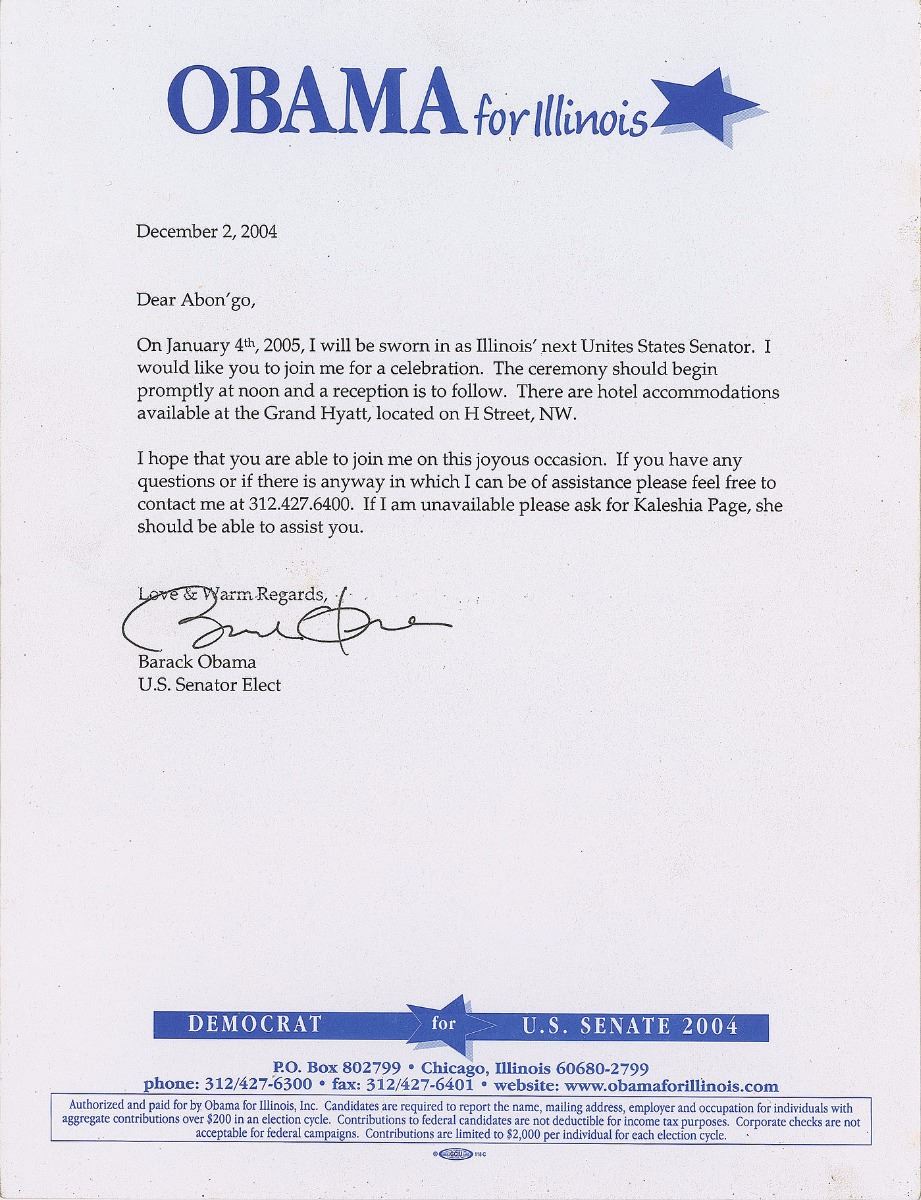 TLS, one page, 8.5 x 11, Obama for Illinois letterhead, December 2, 2004. Letter to his half-brother Malik Abongo Obama, in full: “On January 4th, 2005, I will be sworn in as Illinois’ next Unite[d] States Senator. I would like you to join me for a celebration. The ceremony should begin promptly at noon and a reception is to follow. There are hotel accommodations available at the Grand Hyatt, located on H Street, NW. I hope that you are able to join me on this joyous occasion. If you have any questions or if there is anyway in which I can be of assistance please feel free to contact me at 312.427.6400. If I am unavailable please ask for Kaleshia Page, she should be able to assist you.” In fine condition.