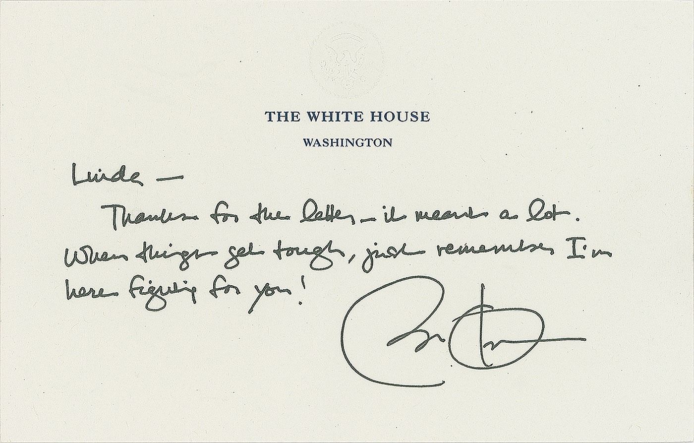 Extremely rare ALS as president, one page, 6.5 x 4, embossed White House stationery, no date. Response to a woman entreating for greater awareness and federal assistance within the mental health sector, in full: "Thanks for the letter—it means a lot. When things get tough, just remember I'm here fighting for you!" In very fine condition. Accompanied by the original White House mailing envelope.