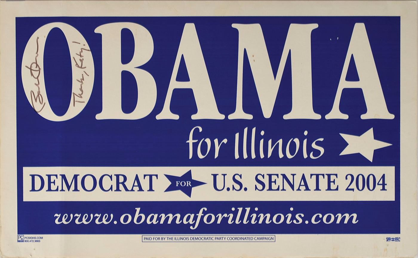 Dual-sided "Obama for Illinois" campaign sign from his 2004 Senate bid, 26.25 x 16, vertically signed and inscribed in the first letter of his surname in black felt tip, "Barack Obama, Thanks, Katy!" In fine condition, with general expected signs of use, and a vertical bend passing between the signature and the inscription.