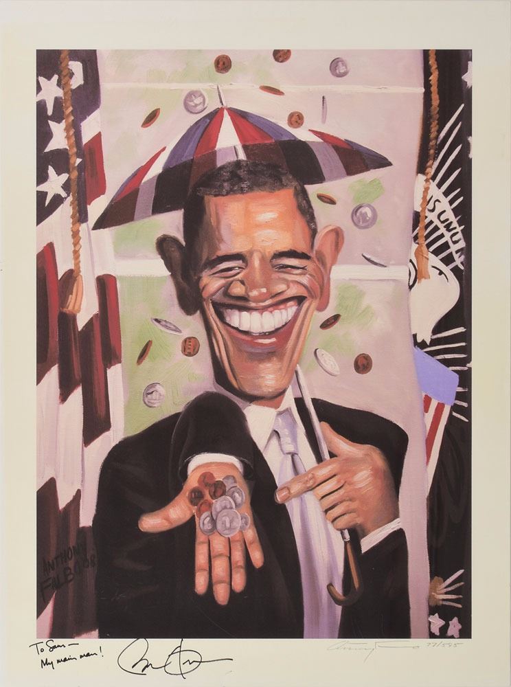 Outstanding color limited edition 17.75 x 24 print entitled 'President Barack Obama Change' by Anthony Falbo, numbered 77/595, signed and inscribed in the lower border in black felt tip to his personal valet Samuel Sutton, "To Sam—My main man! Barack Obama." Also signed in pencil by the artist, Anthony Falbo. In fine condition. Falbo is an internationally renowned 'cubestraction' painter, and this wonderful caricature embodies the 'change' slogans from Obama's campaigns. A magnificent piece with a significant association to one of Obama's closest White House aides.