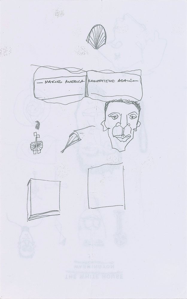 Fantastic original pencil sketches made by President Barack Obama on a white 5 x 8 sheet of White House stationery. The front side of the sheet features a total of 11 drawings, two of which appear to be forward-facing self-portraits; other doodles include a face in profile, another more cartoonish looking face, and various shapes and squiggles. The reverse side features a few more small shape doodles, as well as another self-portrait and two rectangles with the words: “—Making America Competitive Again—.” Obama has also added underlines to the letterhead. In fine condition, with intersecting folds. Accompanied by a letter of provenance from Samuel Sutton, the personal valet to President Obama, in full: "I, Samuel Sutton, worked in the White House as President Barack Obama's personal valet. Prior to working in the Obama Administration, I worked in the White House for George W. Bush. In these capacities, I was given certain souvenirs which I have retained until this day. Among these souvenirs is the item photographed below, a brief description of which is below: A sheet of White House stationery with multiple doodles all executed by President Barack Obama including several self-portraits."