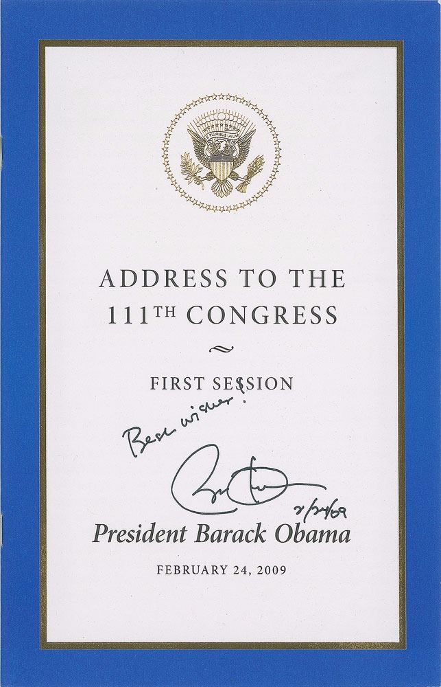 Pamphlet for President Obama's first inaugural address to the 111th Congress on February 24, 2009, fifteen pages, 5.5 x 8.5, signed on the front cover in black ink, "Best wishes! Barack Obama, 2/24/09." In very fine condition. A desirable uninscribed example.