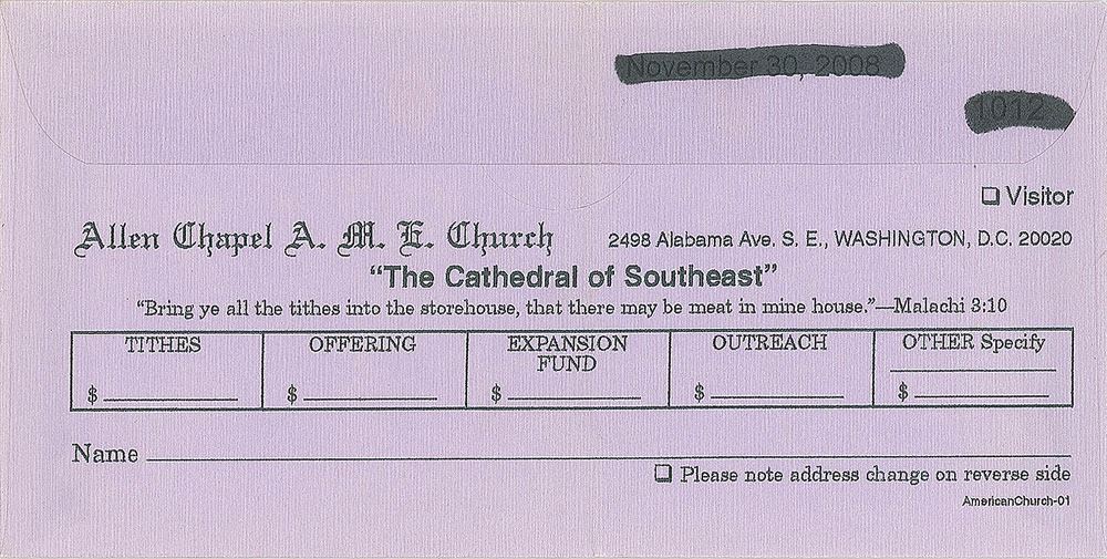 Unique pairing of church collection envelopes, one featuring sketches done by President Obama, and the other featuring two handwritten words by Obama, "I'm lost." The sketches are on the reverse of a green 6.5 x 3.5 envelope for the Allen Chapel Scholarship Fund, and include two high heels, a table with a vase of flowers, and a female face. The "I'm lost" note is penned on a white envelope from Allen Chapel, marked with a blacked-out date of November 30, 2008, on the flap. In fine condition. Accompanied by a letter of provenance for the green envelope from Samuel Sutton, who was President Obama's personal valet, and who worked in such capacity in the White House in both the Obama and Bush administrations. Allen Chapel is an African Methodist Episcopal in southeast Washington, DC, where Obama attended services while president. The November 30, 2008, date on the white envelope is especially interesting, as Obama had won the presidential election only weeks earlier. A decidedly unique offering.