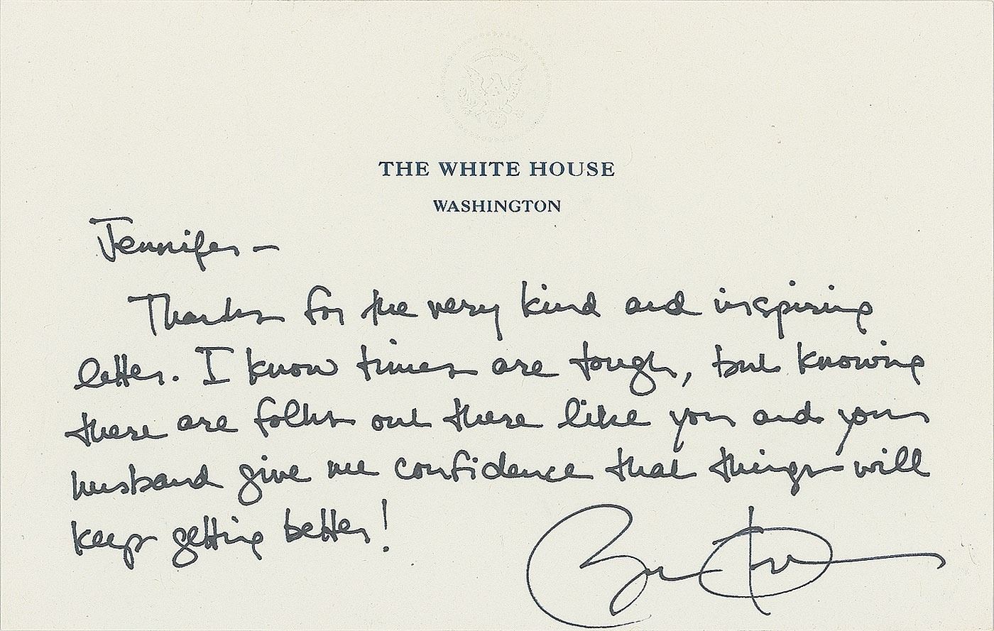 Rare ALS as president, one page, 6.5 x 4, White House stationery card letterhead, postmarked January 11, 2010. Letter to Jennifer Cline, in full: "Thanks for the very kind and inspiring letter. I know times are tough, but knowing there are folks out there like you and your husband give me confidence that things will keep betting better!" In very fine condition. Accompanied by the original White House mailing envelopes, as well as a copy of a Huffington Post article from November 2, 2010, which lends background on the recipient, Jennifer Cline, and the original sale of the letter. The inauguration of Barack Obama coincided with one of the worst financial crises since the Great Depression. Only a month later, on February 17, 2009, Obama signed the American Recovery and Reinvestment Act, a $787 billion economic stimulus package designed to cut taxes, extend unemployment benefits, and fund public works projects. The plan worked gradually, and within seven months’ time the nation’s GDP growth turned positive thanks in part to $240 billion pumped into the economy. During his State of the Union speech on January 27, 2010, Obama declared ‘the markets are now stabilized, and we've recovered most of the money we spent on the banks.’ From the time of that message to the day Obama left office, an on-the-mend US economy created about 2.4 million jobs per year. An inspiring message of hope relating to what is perhaps Obama’s greatest accomplishment—handwritten letters from Obama as president remain especially scarce.