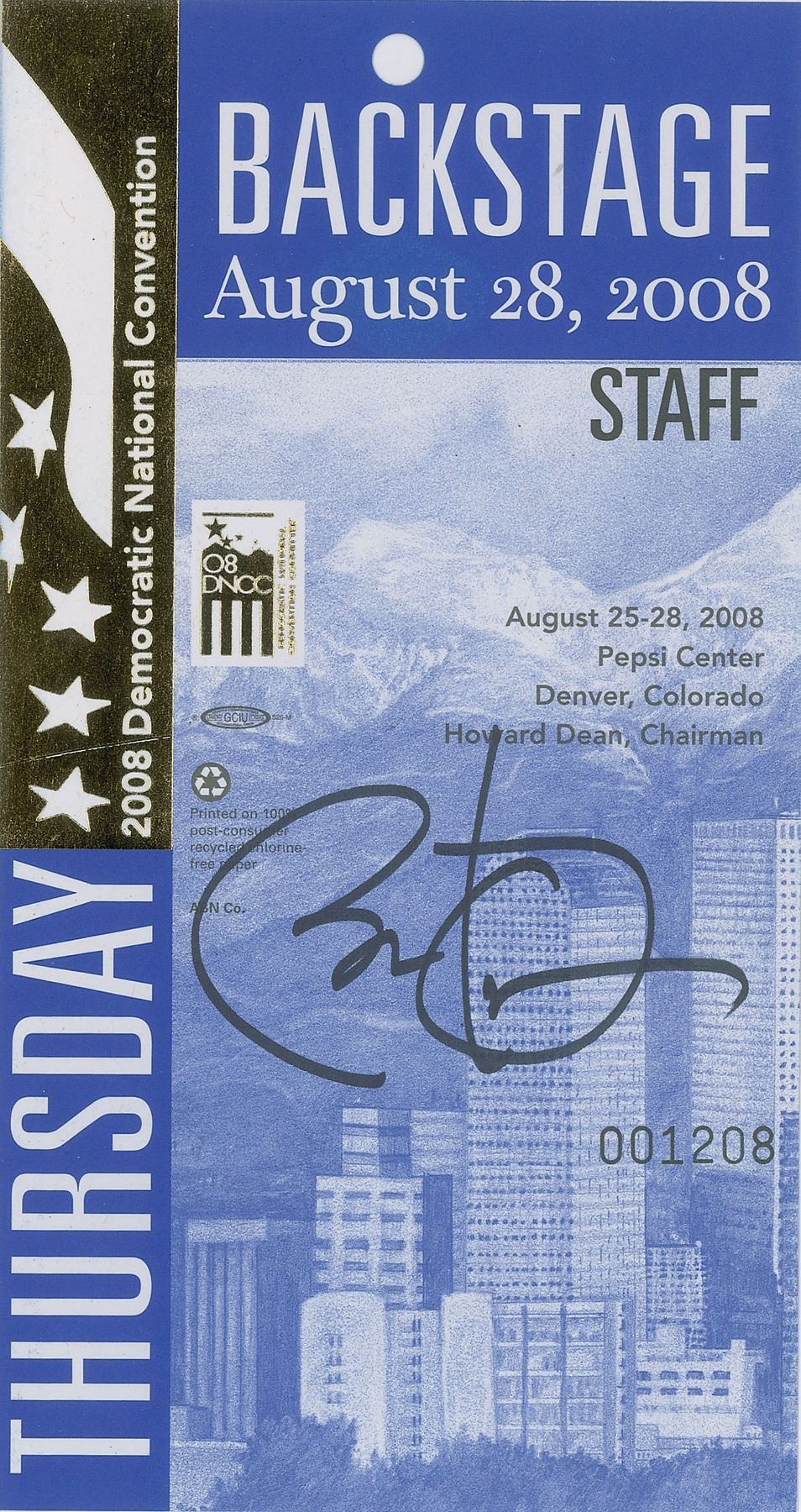 Desirable backstage staff pass for the Democratic National Convention in Denver on August 28, 2008, the day that Barack Obama was officially nominated for the presidency, 4 x 7.5, signed in black felt tip. In very fine condition. Accompanied by a full letter of authenticity from Beckett Authentication Services. A choice piece from a significant day in history.