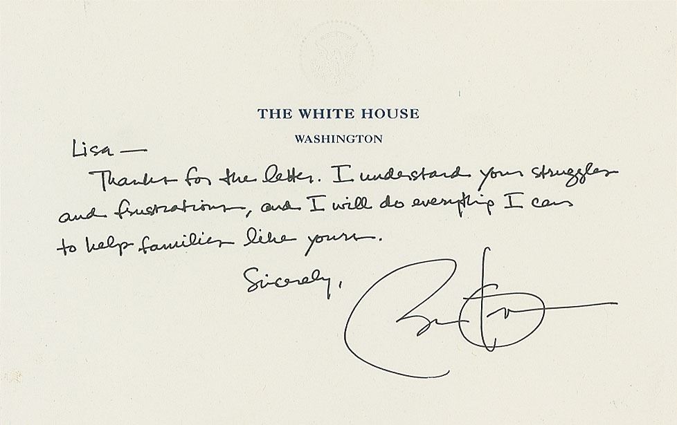 ALS as president, one page, 6.5 x 4, White House stationery card letterhead, no date but circa 2009. Letter to "Lisa," in full: "Thanks for the letter. I understand your struggles and frustration, and I will do everything I can to help families like yours." In very fine condition. Accompanied by the original White House mailing envelope and a letter of provenance from the original recipient, which reads, in part: "Back in 2009, I found myself frustrated with our current political climate, social climate as well as the state of our healthcare system. For the first time in my life I decided to write a sitting President and express my concerns that poor families face everyday. I was back in college in Kansas City, Missouri and was enduring my 3rd diagnosis of cancer…I was taking out loans to pay for college, loans to help cover my chemotherapy treatments, insurance copays and deductibles. In years past I had lost my health insurance because there were no laws in place to protect me from lifetime benefit caps on health insurance. I was terrified it was going to happen to me once again…To make matters worse, I was taking out astronomical amounts of college loans….It seemed like a vicious circle of never ending debt. I wanted a better life for my family and my education was my way out…In the end, I beat my cancer and finished college in 2012. The greatest thing I believe my letter accomplished was contributing to the healthcare reform act. My Mom, who passed away from cancer 9/1/2018 was able to fight with all her might because of those laws President Obama created…I was deeply frustrated when I wrote this letter and President Obama clearly understood this frustration. I was very surprised when I received this note from our President. It was the 1st time I felt like my voice had actually been heard and that it mattered."