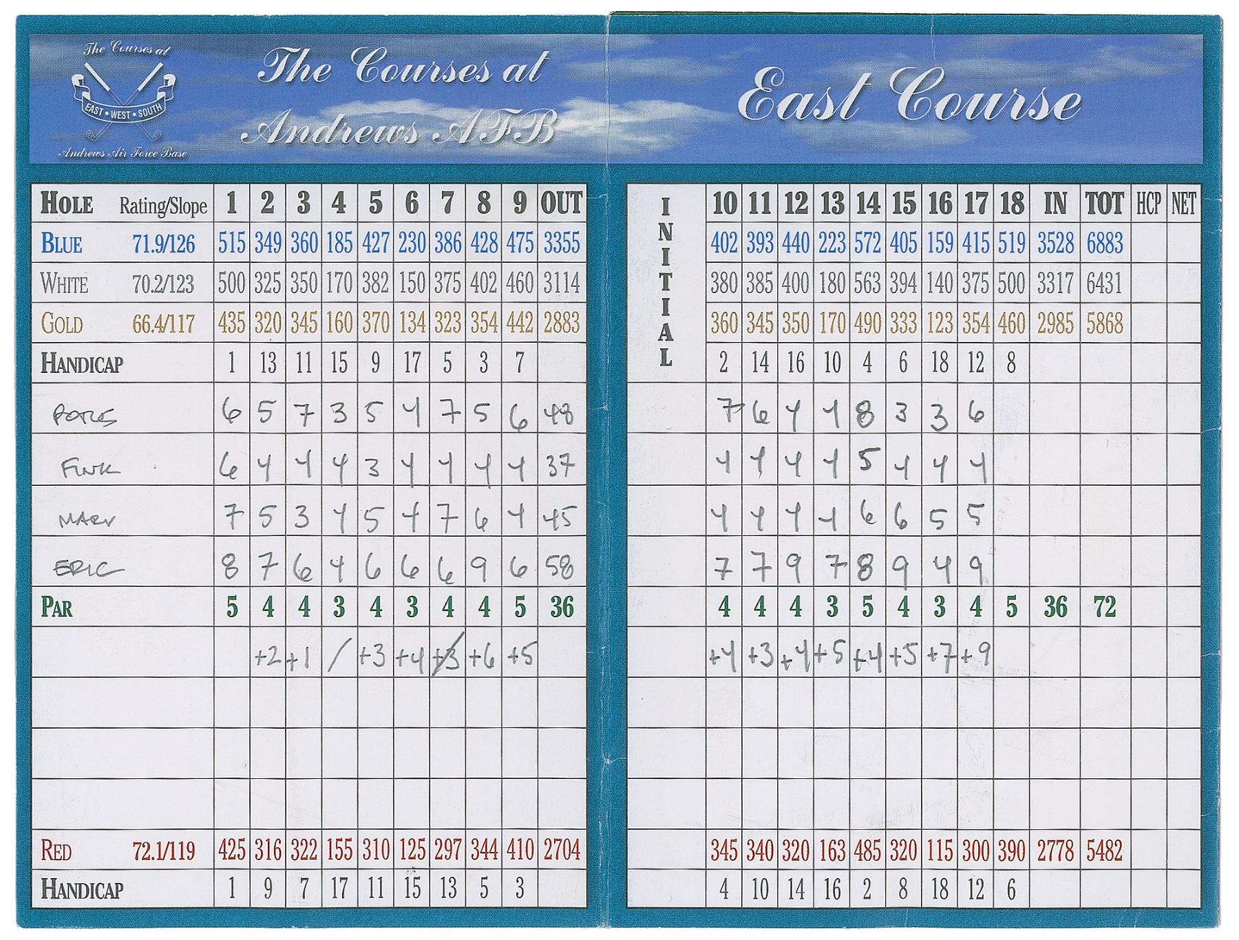 President Barack Obama’s tri-fold score card from the East Course at Andrews Air Force Base in Joint Base Andrews, Maryland, measuring 12 x 6, no date, filled out entirely by the president in pencil, who signs in the player field, “POTUS,” and tracks the score for his three playing partners—“Fink,” “Marv,” and “Eric”—over 17 played holes. In fine condition.