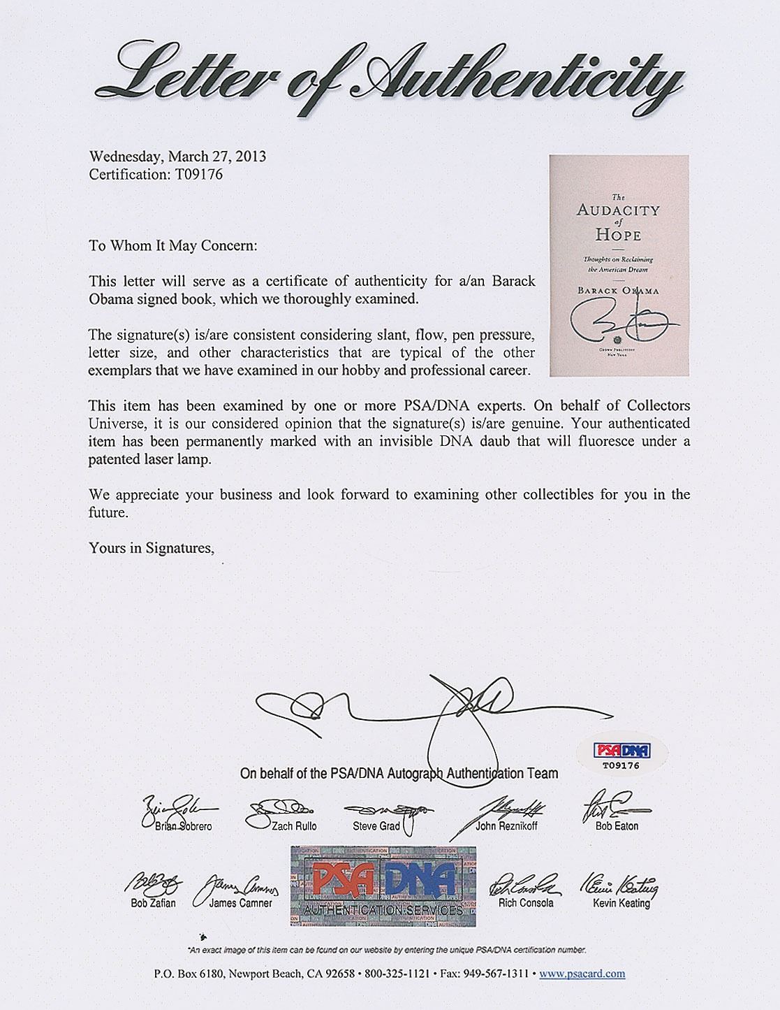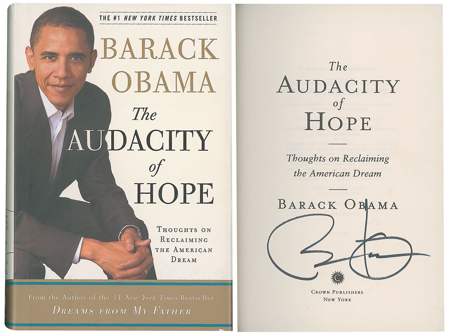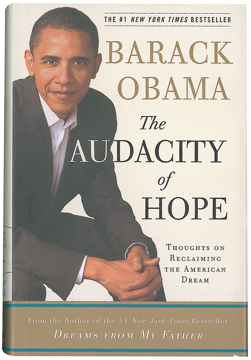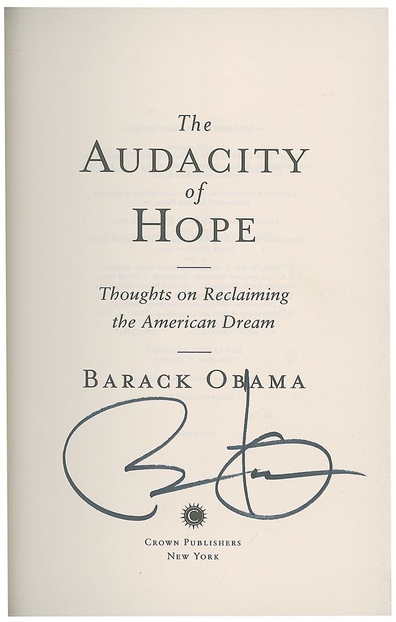 Signed book: The Audacity of Hope. First edition, later printing. NY: Crown Publishers, 2006. Hardcover with dust jacket, 6.5 x 9.5, 375 pages. Signed on the title page in black felt tip. Autographic condition: fine. Book condition: F/VG+; dust jacket has light wear to edges and easily removable price-sticker to rear cover. Accompanied by a full letter of authenticity from PSA/DNA.