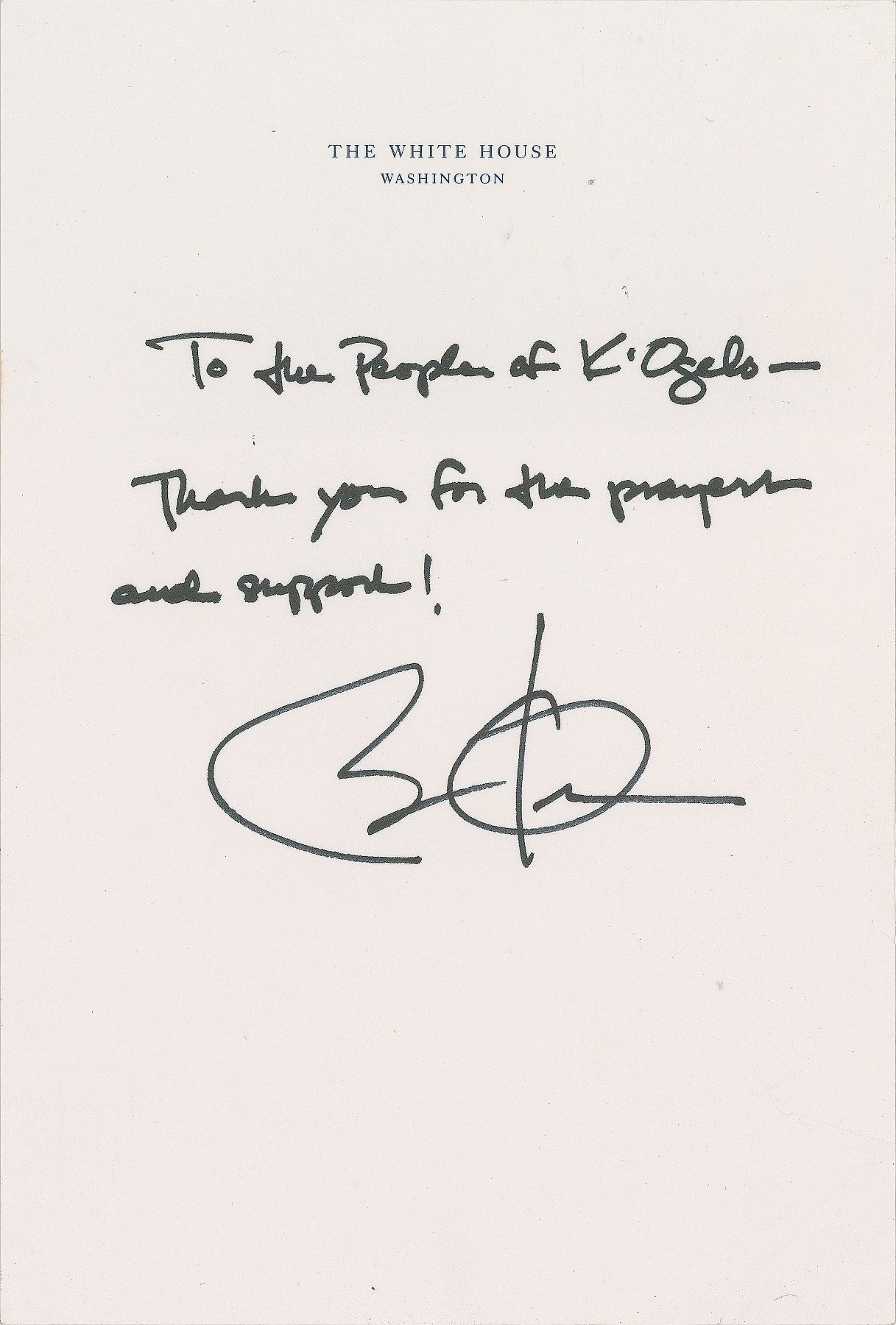 ANS as president, one page, 6.25 x 9.25, White House letterhead, no date. In full: "To the People of K'Ogelo—Thank you for the prayers and support! Barack Obama." In very fine condition. President Obama's father was born and raised in K'Ogelo, Kenya, and in 1960 at age 24 enrolled at the University of Hawaii. There he met Ann Dunham, and the next year she became pregnant with the future president. A remarkable association with Obama's family and past, which he chronicled in the acclaimed 1995 book Dreams from My Father.