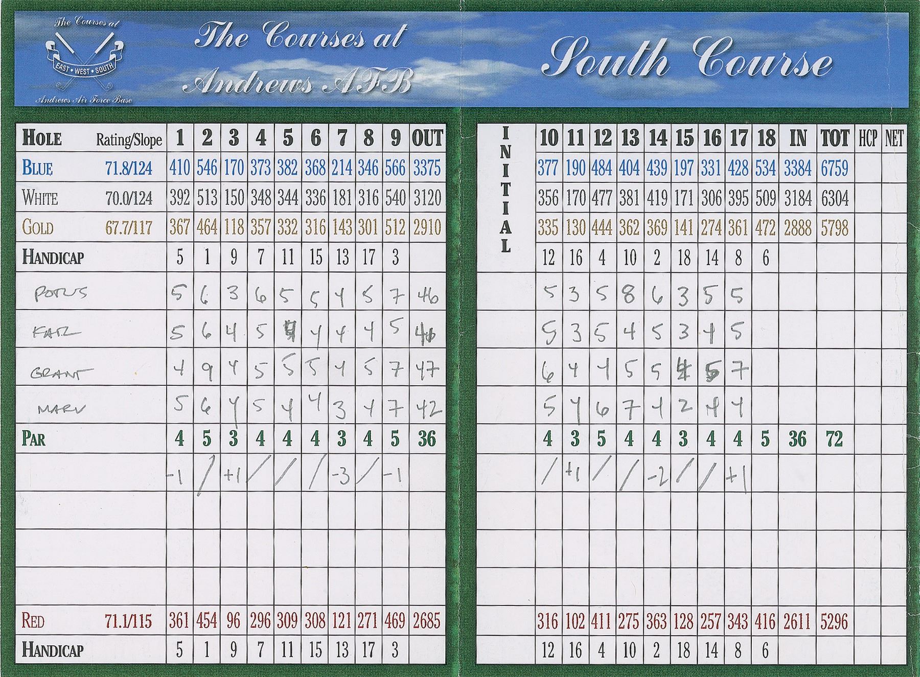 President Barack Obama’s tri-fold score card from the South Course at Andrews Air Force Base in Joint Base Andrews, Maryland, measuring 12 x 6, no date, filled out entirely by the president in pencil, who signs in the player field, “POTUS,” and tracks the score for his three playing partners—“Katz,” “Grant,” and “Marv”—over 17 played holes. In fine condition.