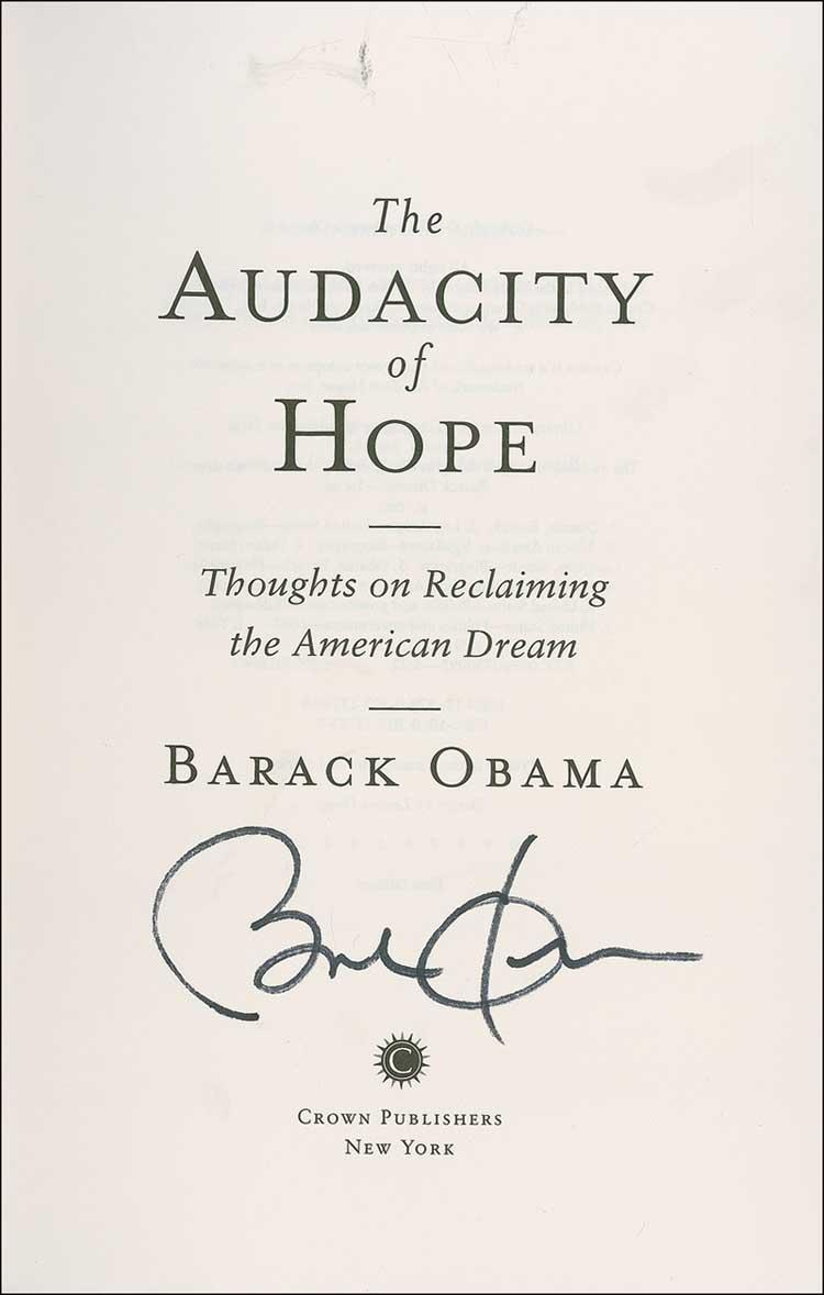 Signed book: The Audacity of Hope. First edition, later printing. NY: Crown Publishers, 2006. Hardcover with dustjacket, 6.5 x 9.5, 375 pages. Signed on the title page in black felt tip. In fine condition, with a few small creases and dings to dustjacket. Pre-certified PSA/DNA and RRAuction COA.