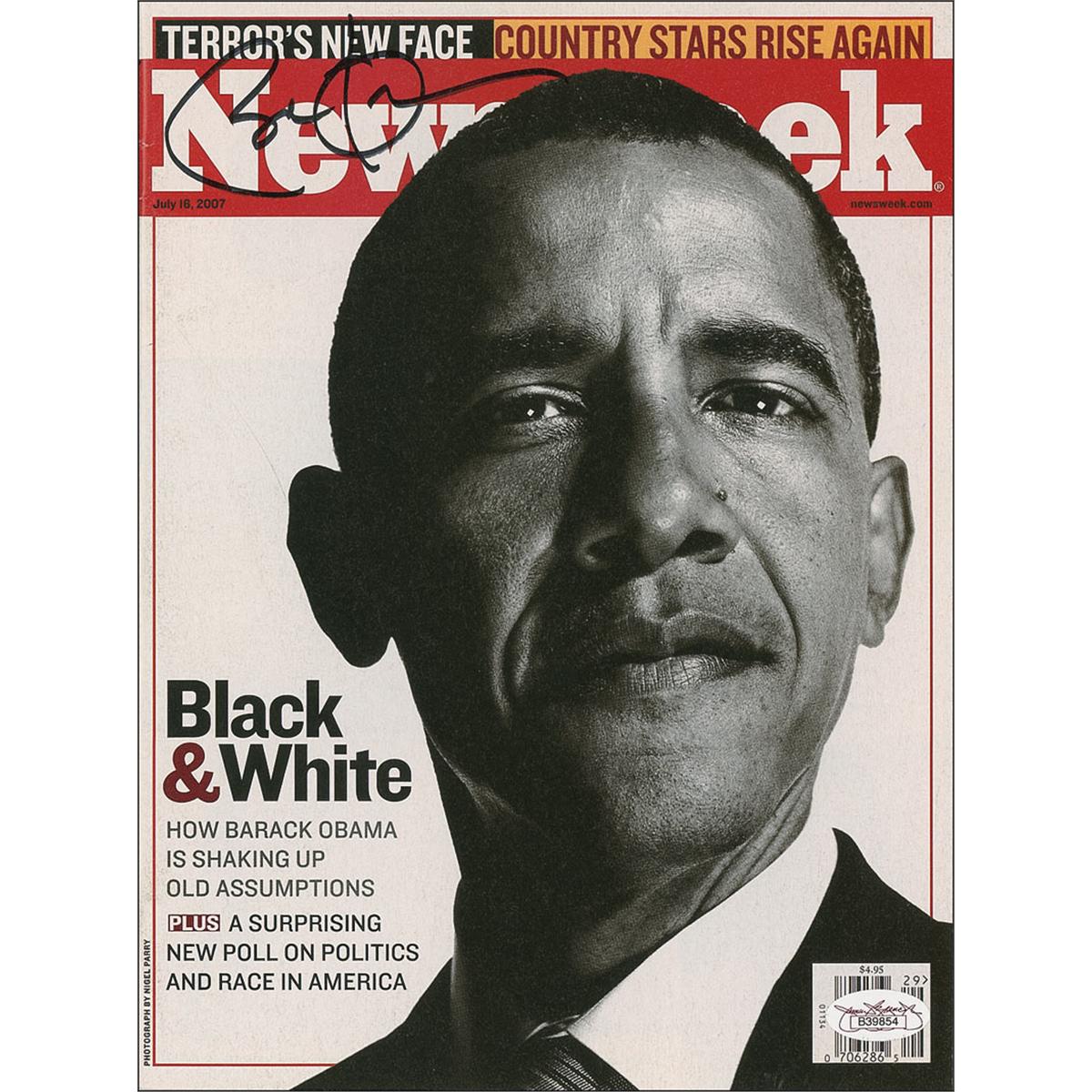 Newsweek magazine, dated July 16, 2007, featuring Obama on the cover, signed on the cover in black felt tip. In fine condition, with a James Spence authentication label affixed to lower corner. Accompanied by a letter of authenticity from James Spence.