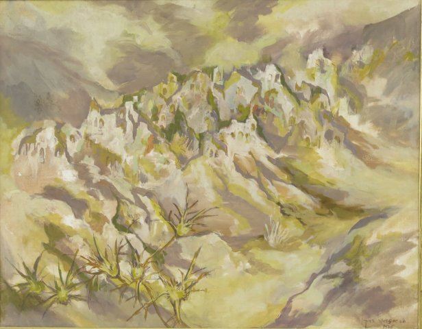 Oil on board. Framed. Signed & dated in Hebrew 1975, lower right. Approx. 21" H x 27" W unframed, 27" H x 33" W framed. From a NYC collector's 40 year compilation.