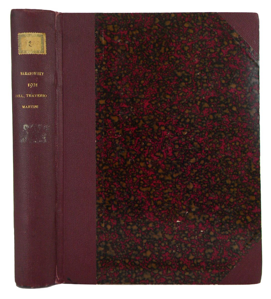 Baranowsky, Michele. COLLEZIONI NUMISMATICHE VALERIO TRAVERSO DI GENOVA, MR. JOSEPH MARTINI OF NEW YORK E DI ALTRI AMATORI. MONETE GRECHE E ROMANE. Milano, 25 Febbraio 1931 e giorni successivi. 4to, contemporary red cloth and mottled boards, gilt. (4), 237, (1) pages; 3351 lots; 76 fine plates of coins. Very good or better. A notable collection. Clain-Stefanelli 1780. Grierson 288. Spring 5 [also listed under "Most important sales of ancient Greek coins," "Most important sales of aes grave," "Most important sales of struck Roman Republican coins" and "Most important sales of Roman Imperial coins"]. See catalogue for full description.