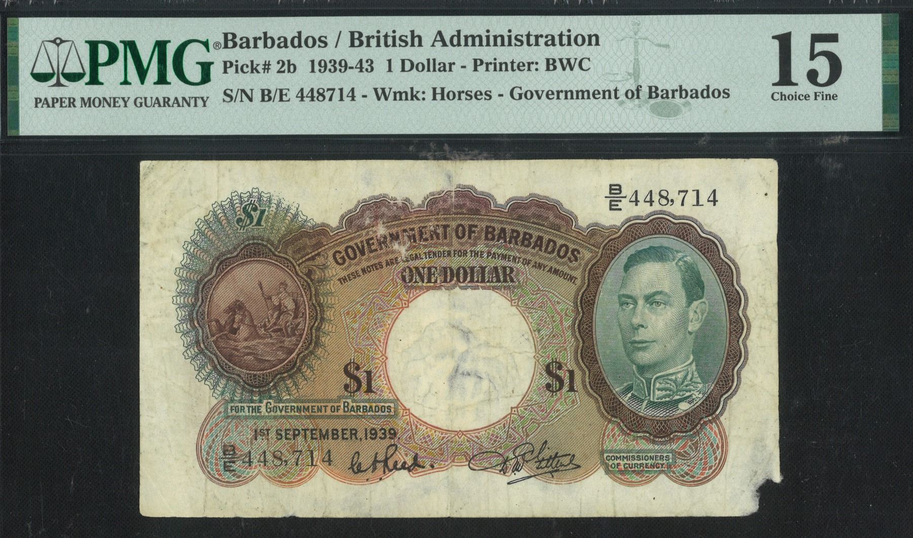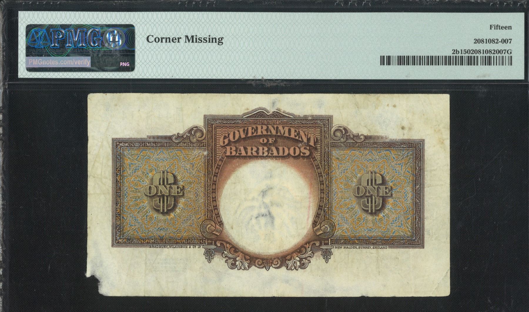 Barbados, 1939-43, $1, B/E 448714. PMG 15 Corner Missing.