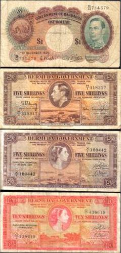 Barbados One Dollar 1939, VG, internal tear. Plus Bermuda Five Shillings 1937 and 1957, both Fine and Ten Shillings 1957, VG-F. Total four notes