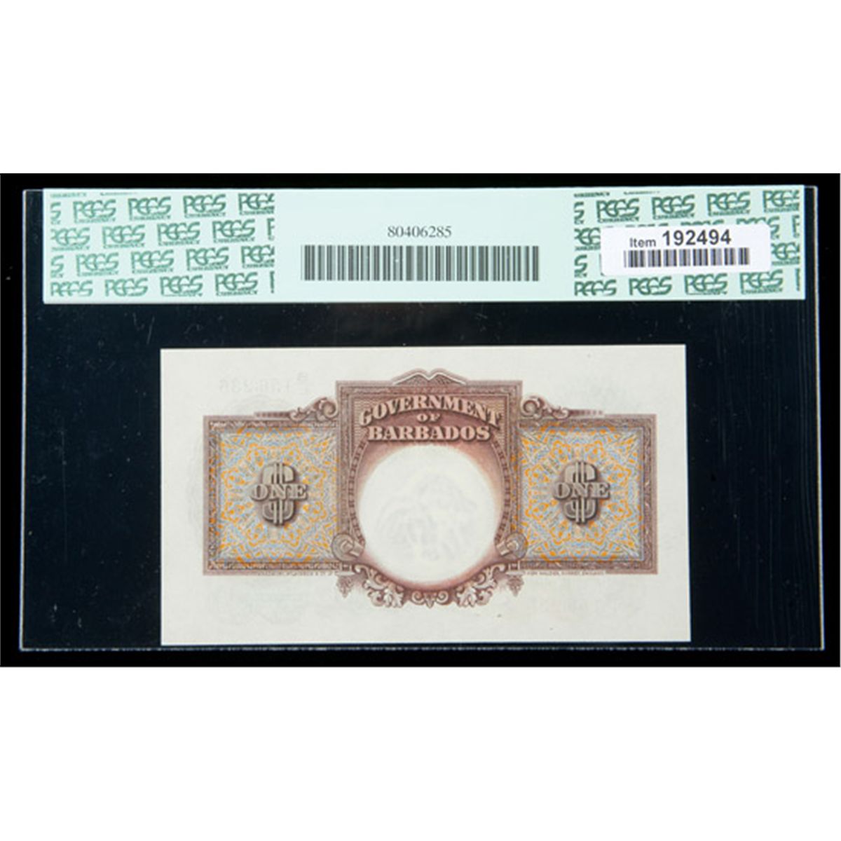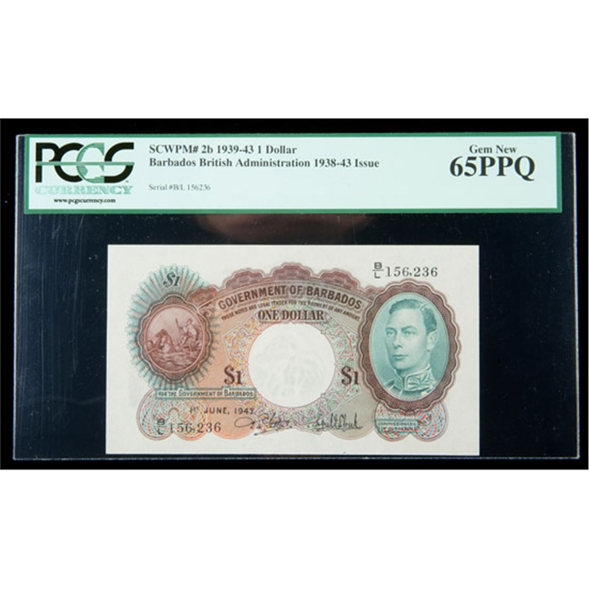 Barbados SCWPM# 2b, 1.6.1943 1 Dollar. PCGS Gem New 65PPQ. . Fr-P-2b. An ideal Gem example with great color, excellent margins and centering, and lovely originality.
