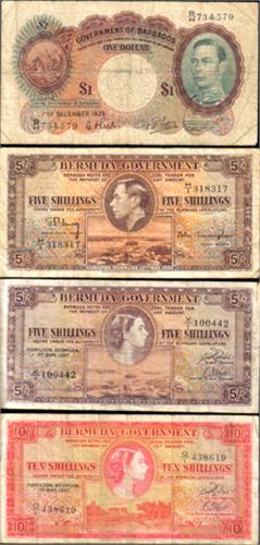 Barbados One Dollar 1939, VG, internal tear. Plus Bermuda Five Shillings 1937 and 1957, both Fine and Ten Shillings 1957, VG-F. Total four notes