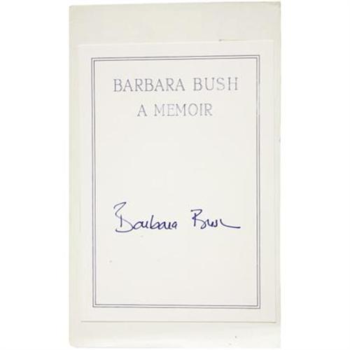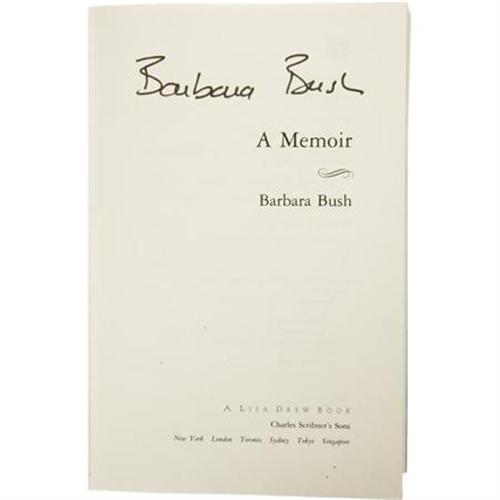<B>Barbara Bush, </B></I><B><I>A Memoir</B></I></B></I><B>, Signed</B></I> (New York: Charles Scribner’s Sons, 1994), x, 575 pages, 8vo, purple boards, unclipped dust jacket. A signed bookplate, mounted on a stiff board, is placed loose in the book. Near mint.<BR><BR>This book has anecdotes full of wit and candor, as only Barbara Bush can tell them. It is also a book that takes us back to Mrs. Bush’s childhood in Rye, New York. She also talks about motherhood and the pain she suffered when she lost a daughter. The life as a First Lady is also vividly told. She talks about George, the campaigns, and the wives of world leaders.<BR><BR><BR><BR><b>Shipping:</b> Books & Catalogs (<a target="_blank" href="http://www.heritageauctions.com/common/shipping.php">view shipping information</a>)