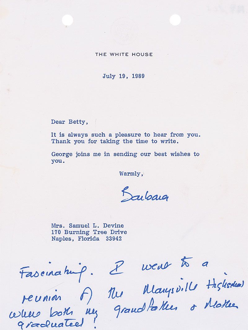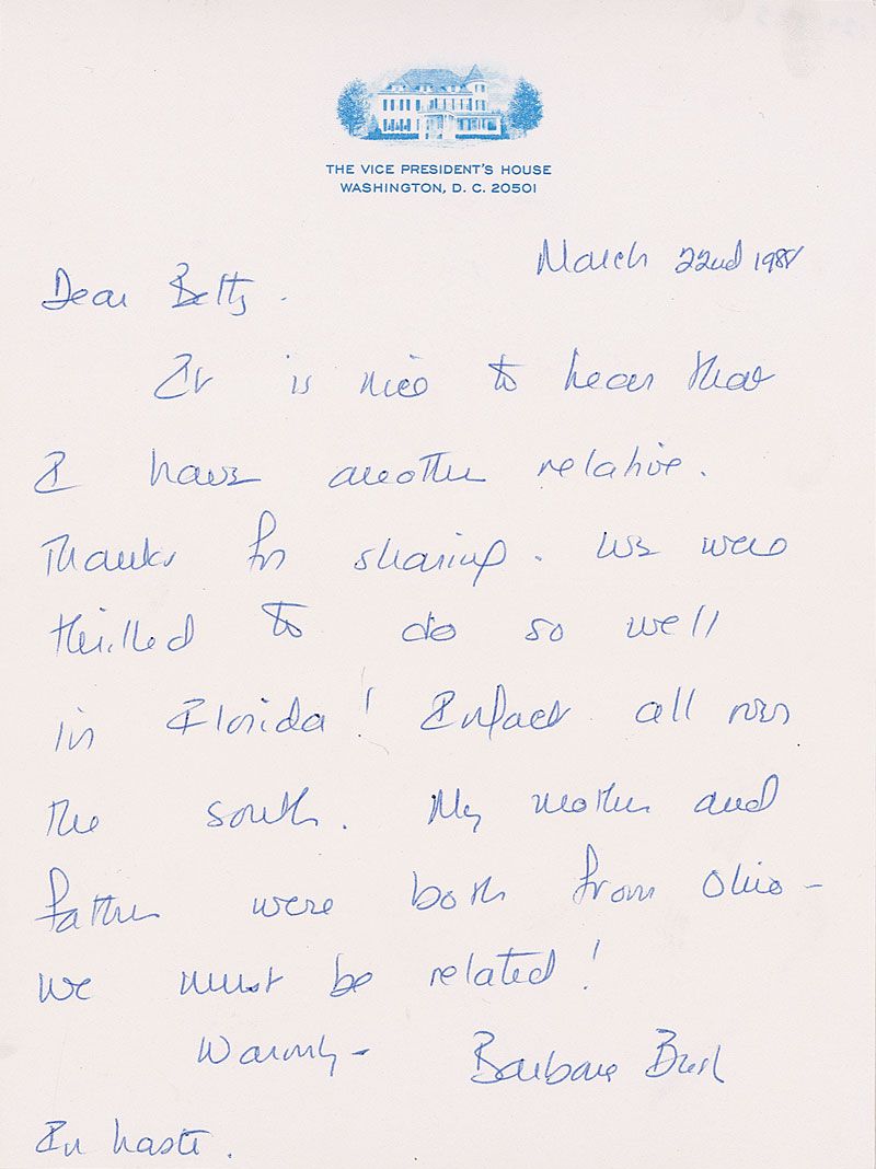 Two letters: one ALS, one page, 6.5 x 8.5, Vice President’s House letterhead, March 22, 1988. In part: “We were thrilled to do so well in Florida! In fact, all over the south”; and one TLS signed “Barbara,” one page, 6.25 x 8.5, White House letterhead, July 19, 1989. A routine thank-you letter with a handwritten postscript, in full: “Fascinating. I went to a reunion of the Marysville High School where both my grandfather & mother graduated!” In overall fine condition, with expected filing holes to top of TLS.