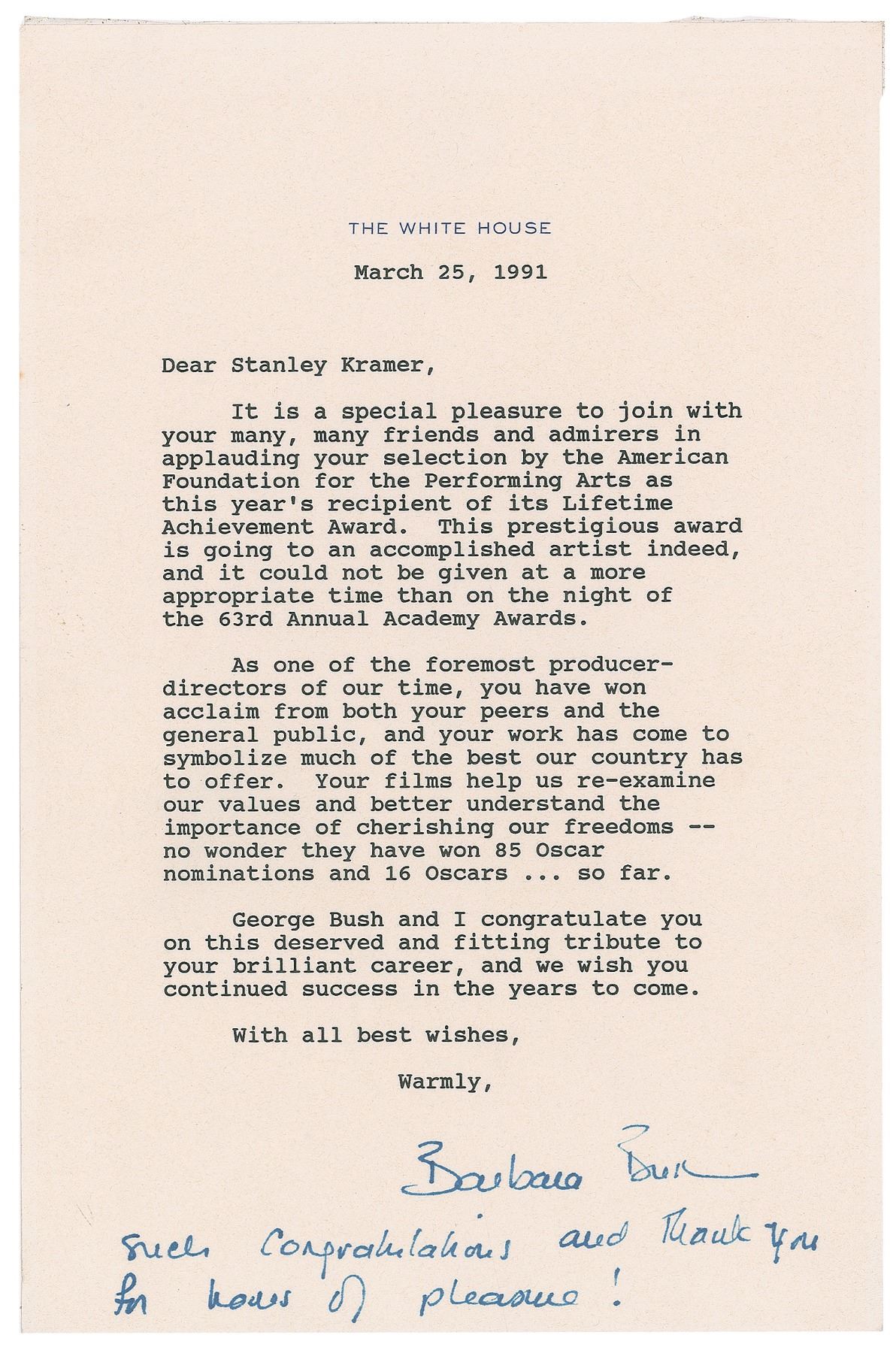 TLS, one page, 6.25 x 9.5, White House letterhead, March 25, 1991. Letter to director Stanley Kramer, in part: "It is a special pleasure to join with your many, many friends and admirers in applauding your selection by the American Foundation for the Performing Arts as this year's recipient of its Lifetime Achievement Award. This prestigious award is going to an accomplished artist indeed, and it could not be given at a more appropriate time than on the night of the 63rd Annual Academy Awards. As one of the foremost producer-directors of our time, you have won acclaim from both your peers and the general public, and your work has come to symbolize much of the best our country has to offer. Your films help us re-examine our values and better understand the importance of cherishing our freedoms—no wonder they have won 85 Oscar nominations and 16 Oscars…so far. George Bush and I congratulate you on this deserved and fitting tribute to your brilliant career, and we wish you continued success in the years to come." Bush adds a handwritten postscript, "Such congratulations and thank you for hours of pleasure!" In fine condition, with a strip of tape along the top back edge.