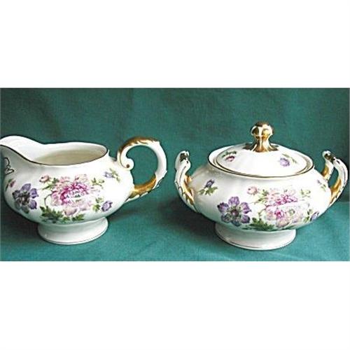 Creamer and sugar set by Franconia Krautheim China Company called Barbara. This lovely lavender and pink floral pattern on cream has gorgeous handles and gilt. Passion flower and crysanthemum type flower make up this gorgeous design on high quality china. Franconia K & A Krautheim Selb Bavaria Germany Barbara. Price is for the set of creamer and sugar bowl with lid in excellent condition.