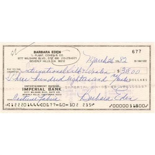 <B>Barbara Eden Signed Sketch.</B></I> A personal check for $318, dated March 26, 1982, and signed by the <I>I Dream of Jeannie</B></I> star in blue ballpoint. In Very Fine to Excellent condition with the usual bank cancellation marks.<BR><BR><b>Shipping:</b> Flat Material, Small (<a target="_blank" href="http://www.heritageauctions.com/common/shipping.php">view shipping information</a>)