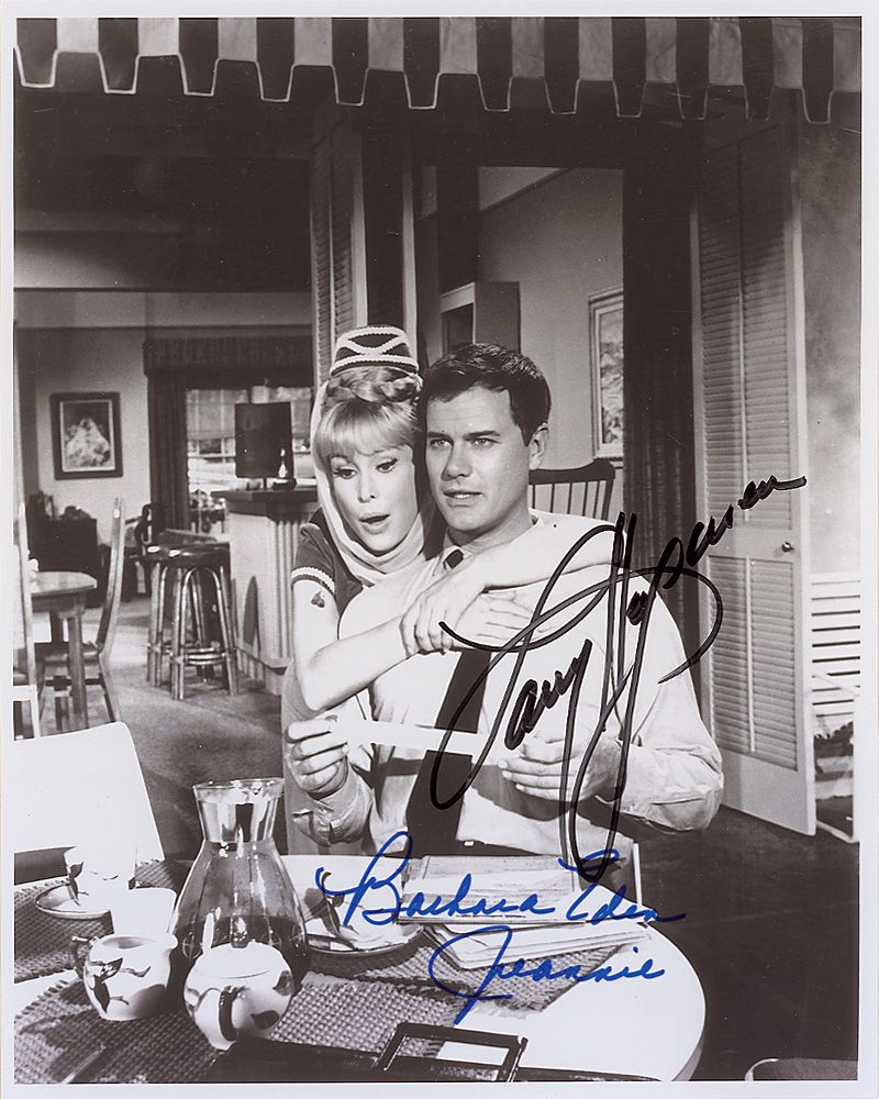 Glossy 8 x 10 photo from I Dream of Jeannie, signed in blue and black felt tip “Barbara Eden, Jeannie,” and “Larry Hagman.” In fine condition.