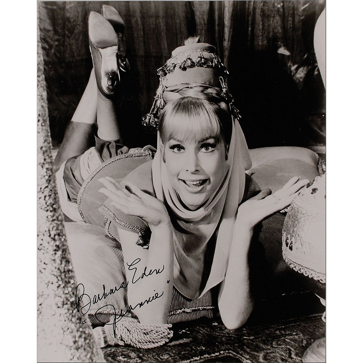 Glossy 16 x 20 photo of Eden as Jeannie, signed in black felt tip, “Barbara Eden ‘Jeannie.’” In fine condition.
