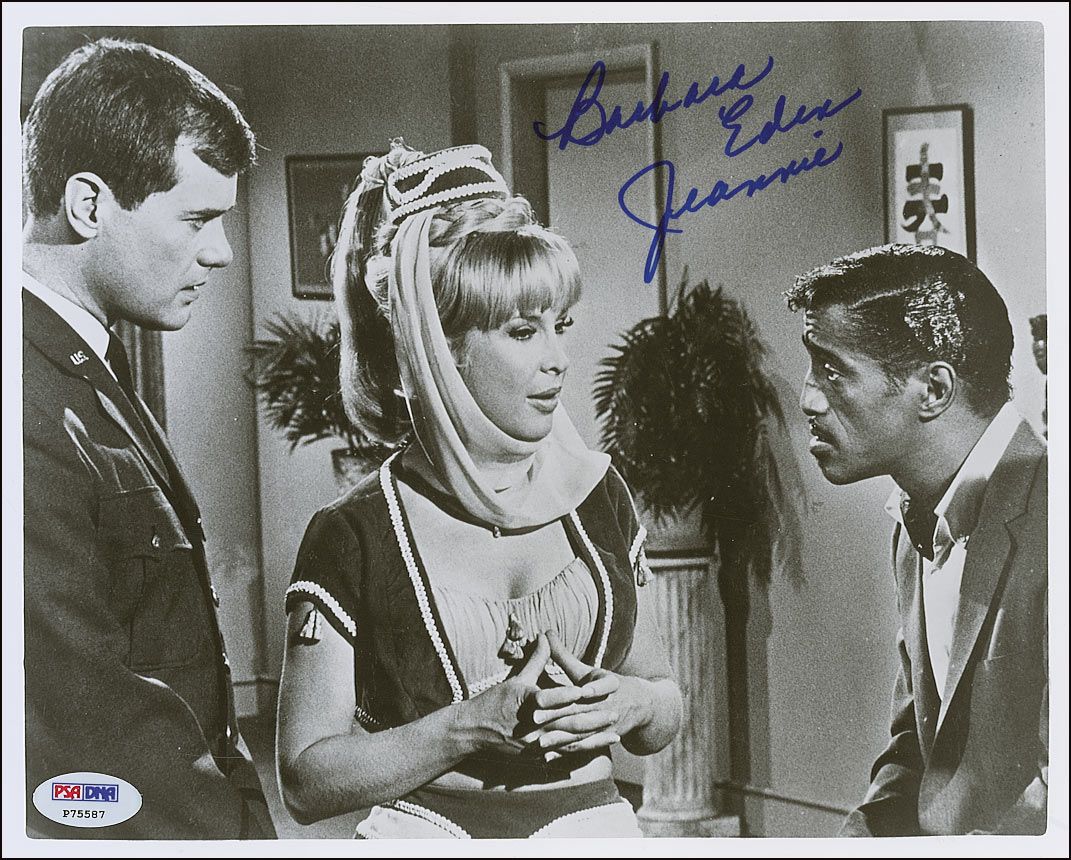 Glossy 10 x 8 photo of Jeannie and Major Nelson talking to Sammy Davis, Jr., signed in blue felt tip, “Barbara Eden, Jeannie.” In fine condition, with a PSA/DNA authentication label affixed to lower corner. Accompanied by a certificate of authenticity from PSA/DNA.