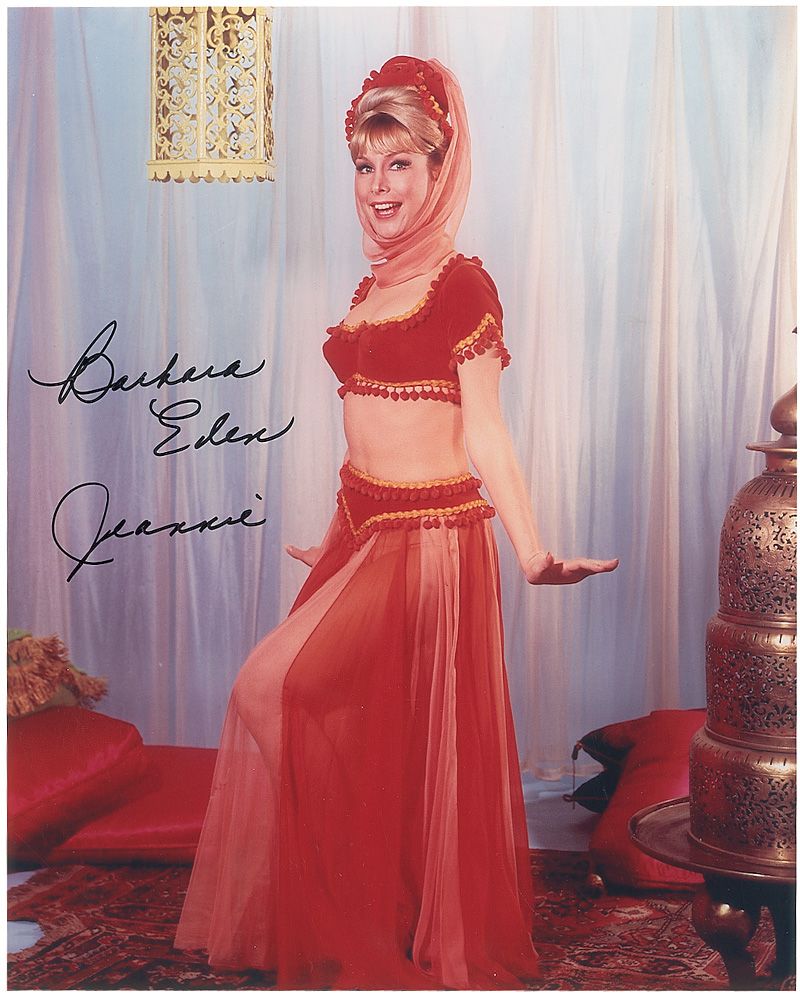 Two color glossy 8 x 10 photos of Eden from I Dream of Jeannie, signed in blue and black felt tip “Barbara Eden, Jeannie.” In fine condition.