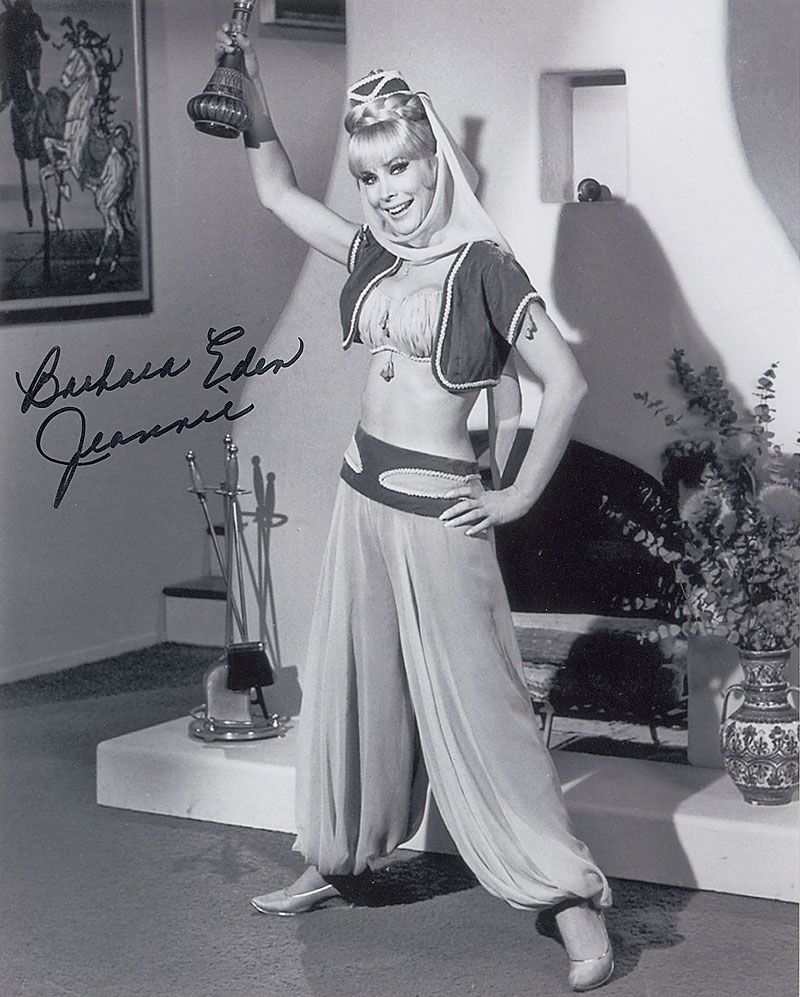Two satin-finish 8 x 10 photos of Jeannie, one color, each signed in black felt tip by Eden, adding her character name to one photo. In very fine condition.